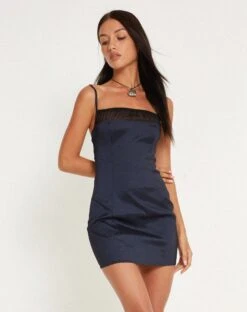 Fitted bodycon mini dress featuring a slinky cowl neck in royal blue.