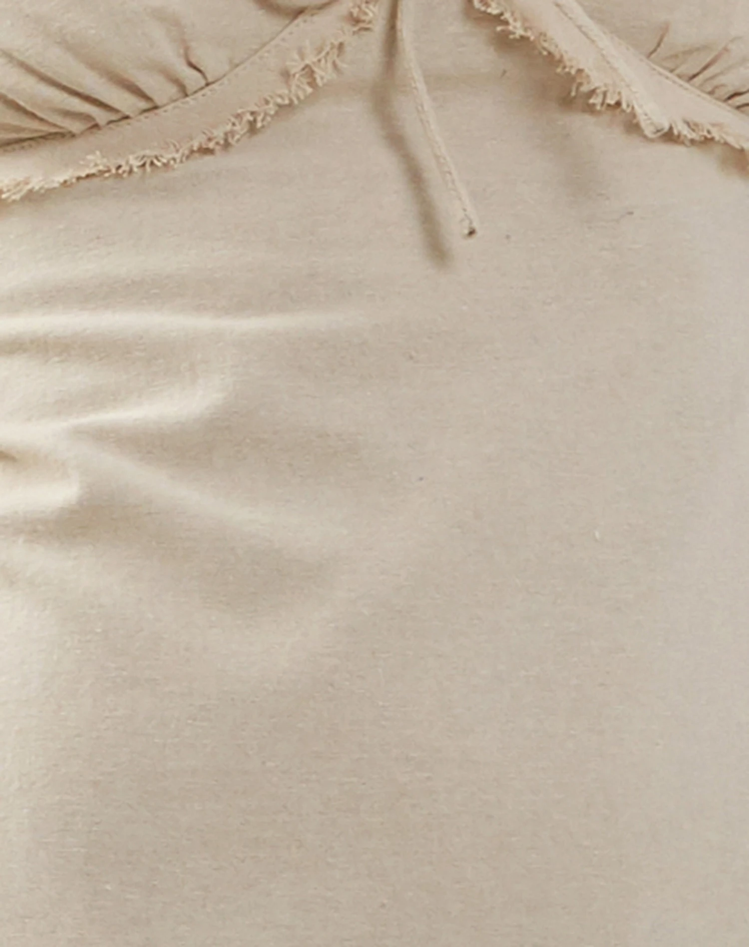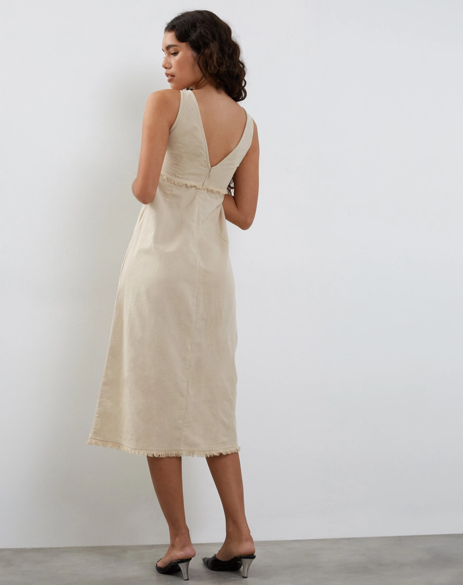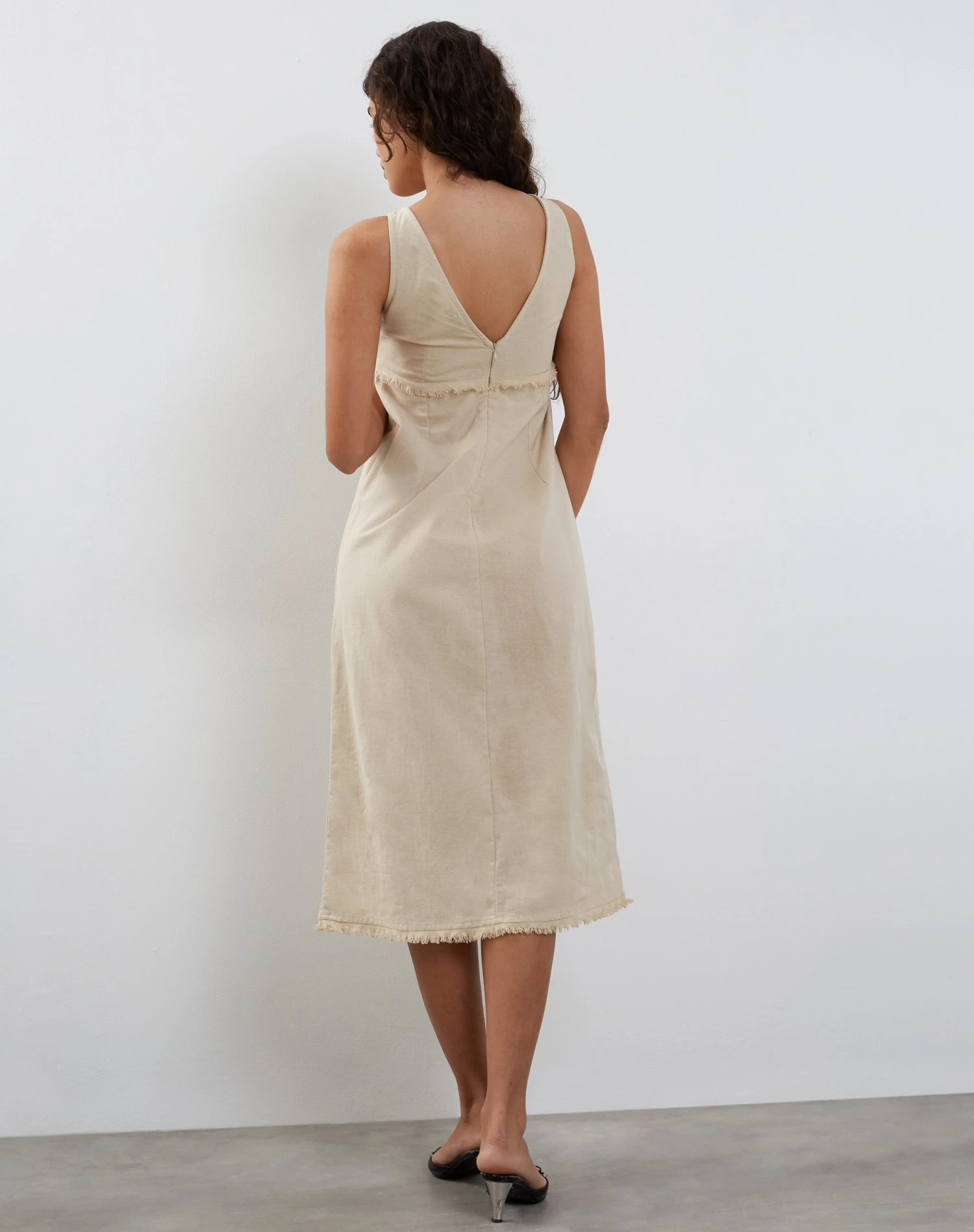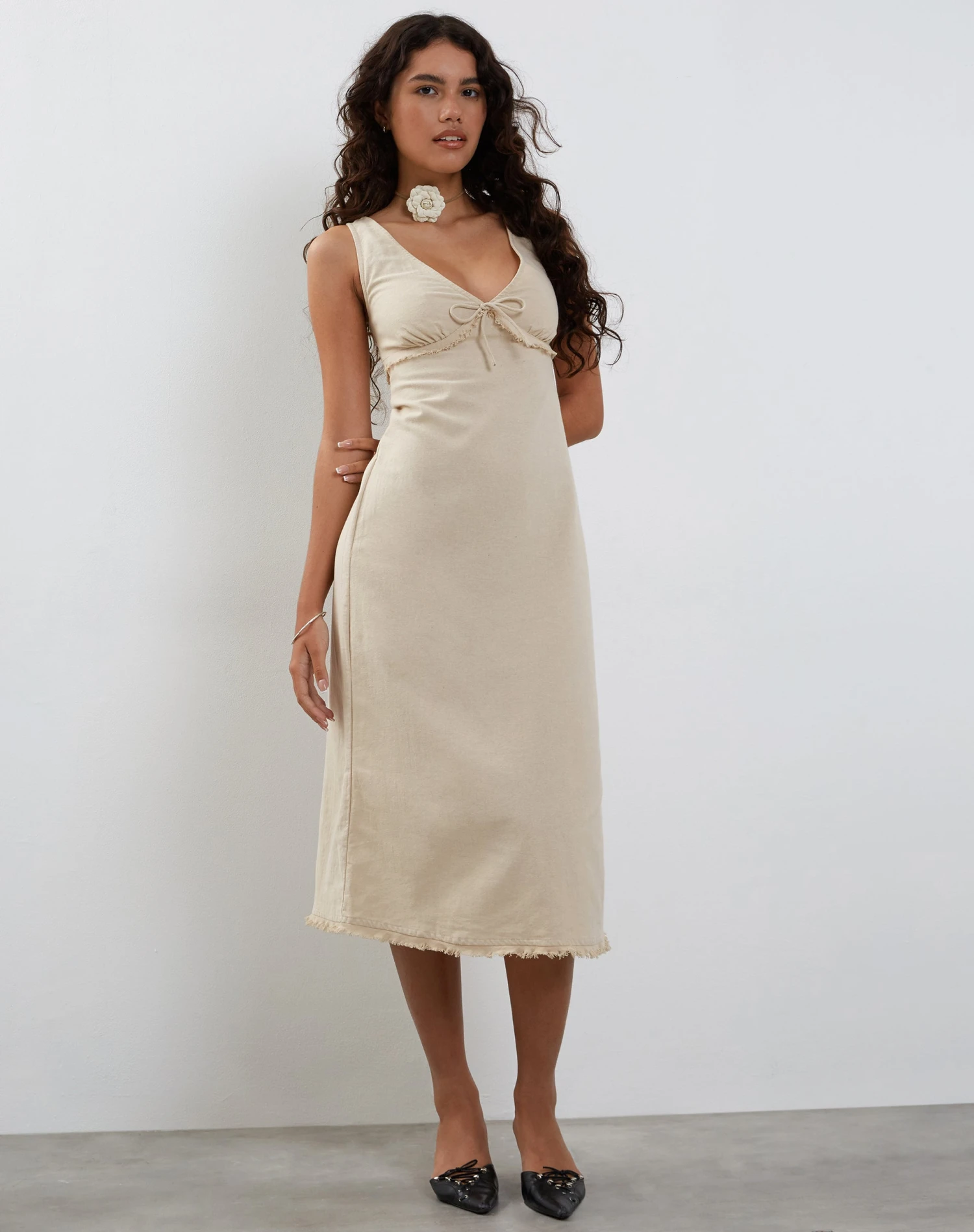 In ecru, featuring a midi linen dress with thick straps and v shaping at front and back with a bow detail at centre bust with a concealed zip at back with frayed hem finish.