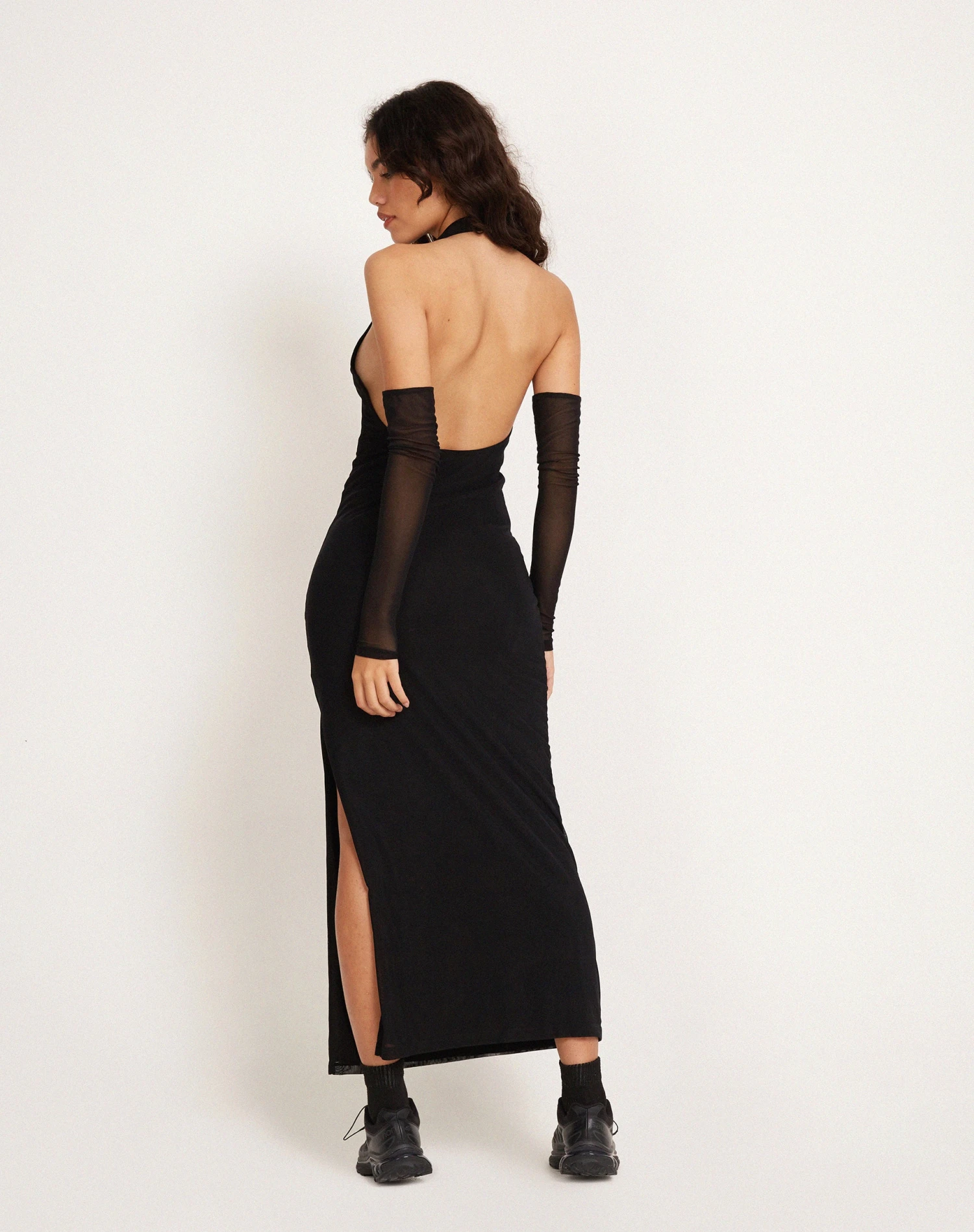 Halterneck maxi dress in black, featuring a deep v neckline, bodycon fit and detachable sleeves with mesh overlay.