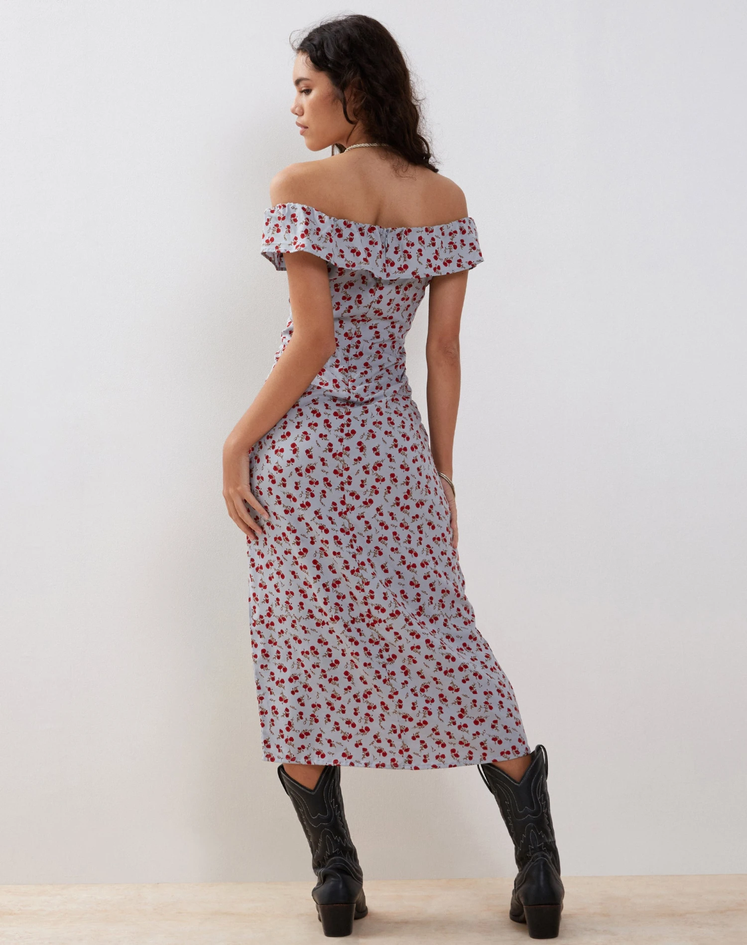 Add some print to your wardrobe with the Ayudia dress. In blue, it features a sleeveless, midi fit with a concealed zip centre back and a bardot neckline with frills. Detailed with a repeat ditsy floral print in red.