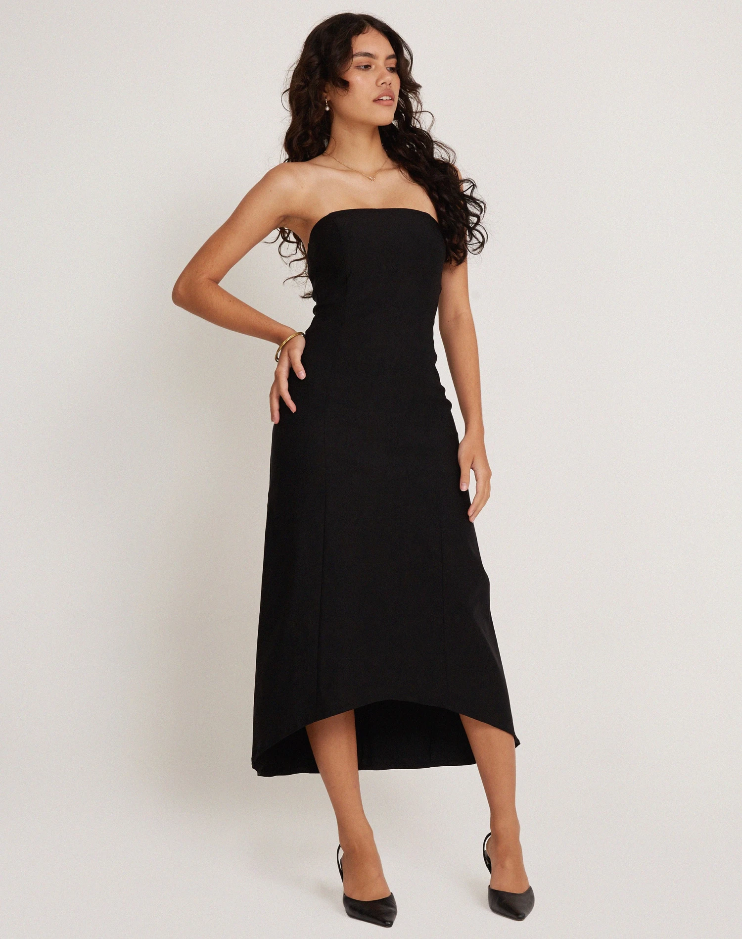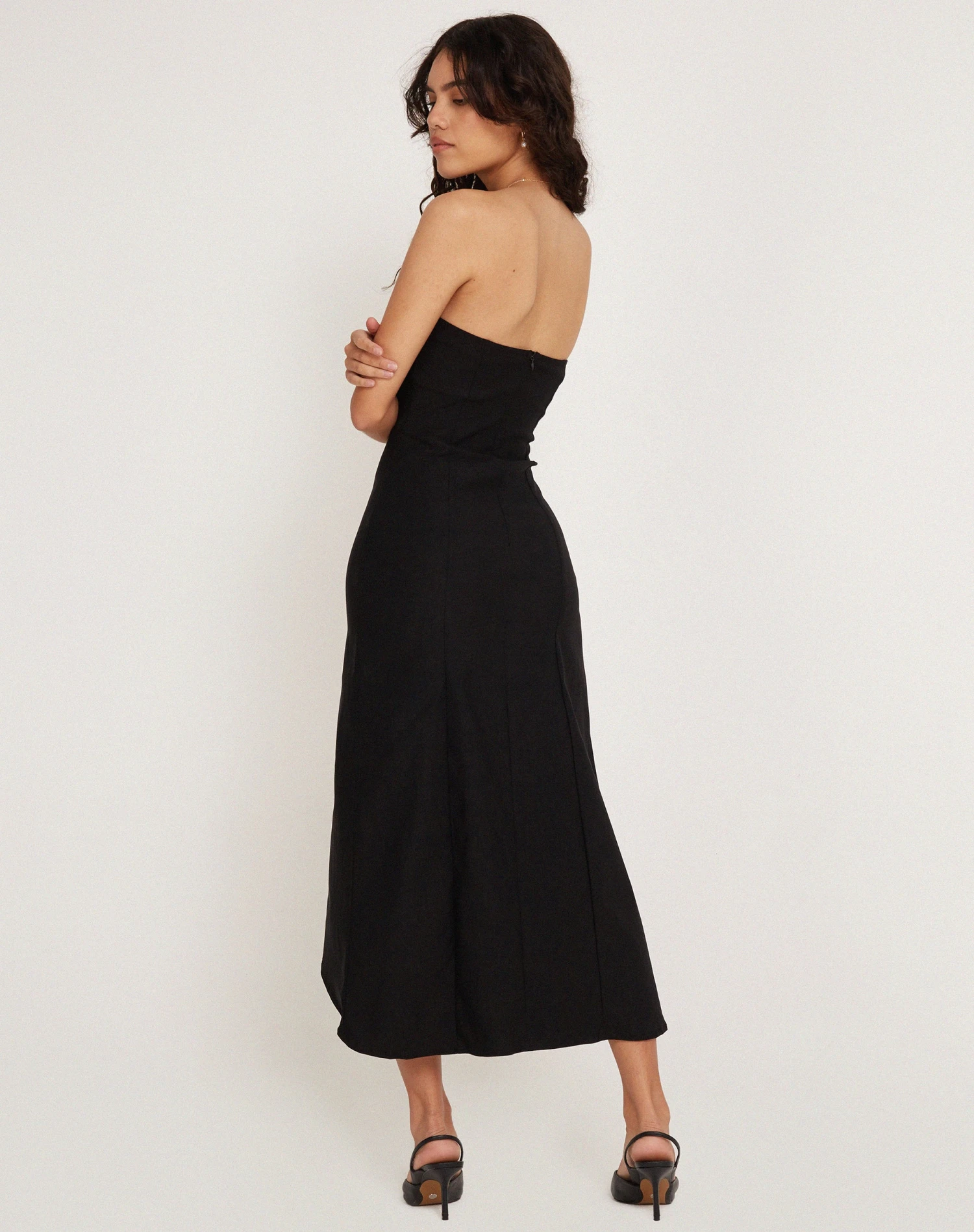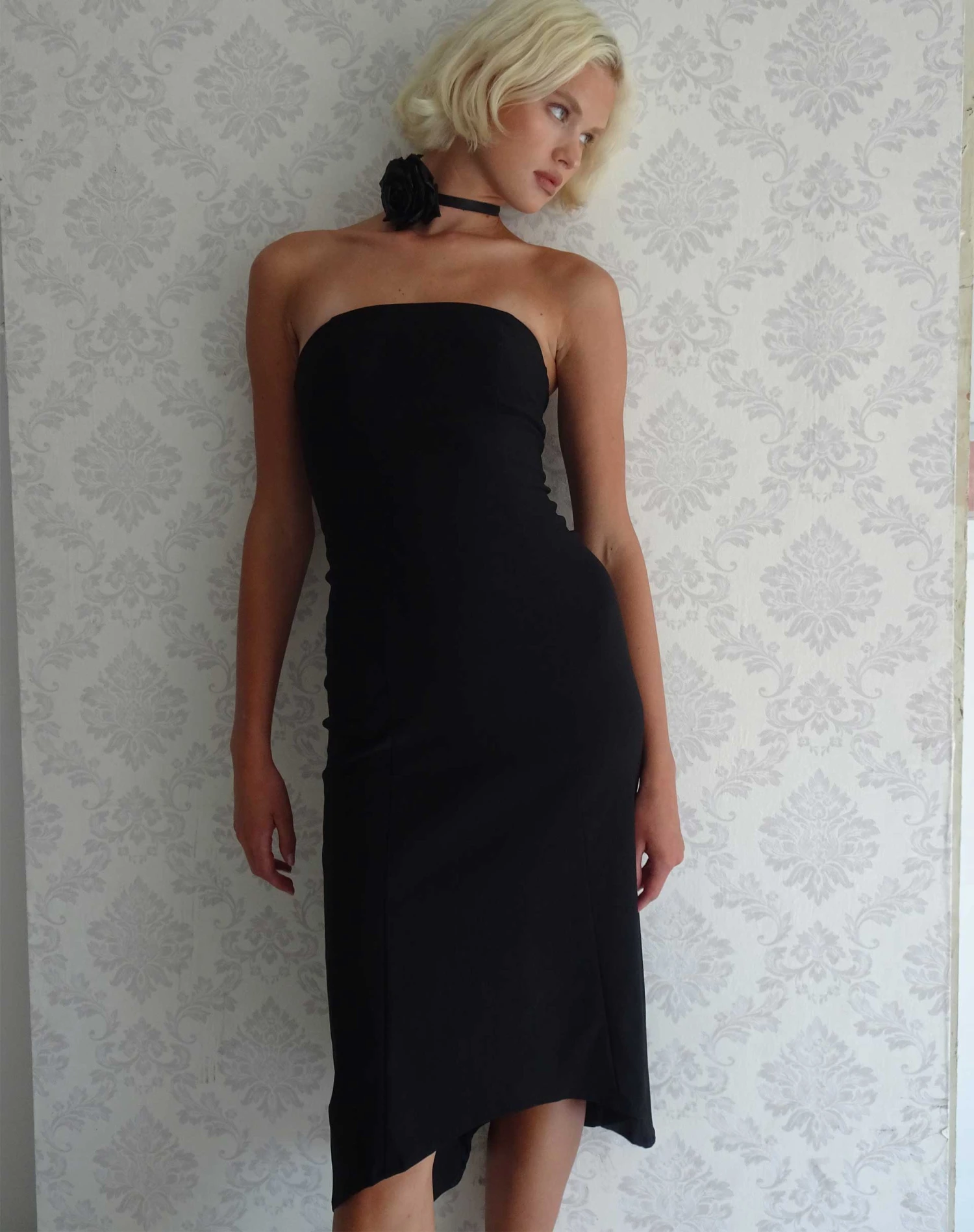 Bellini is a classic black dress, featuring a bandeau neckline and midi length fit with a tulip hem.