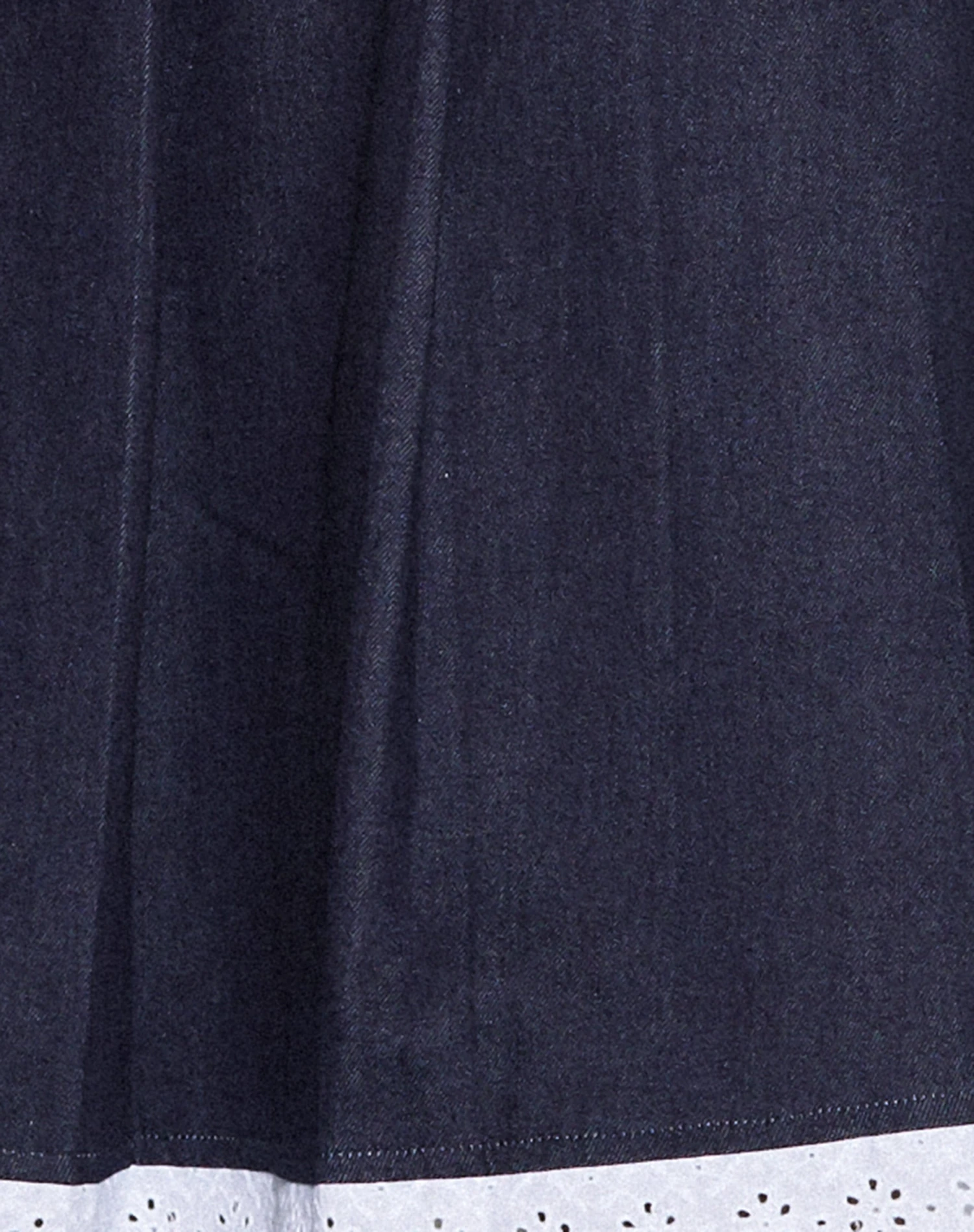 In an indigo chambray fabric, our Caralia skirt features a midi length hem with a low waistline and a flared, A-line fit with pleating. Finished with white broderie detailing along hemline Complete the co-ord with our Kayatra top.