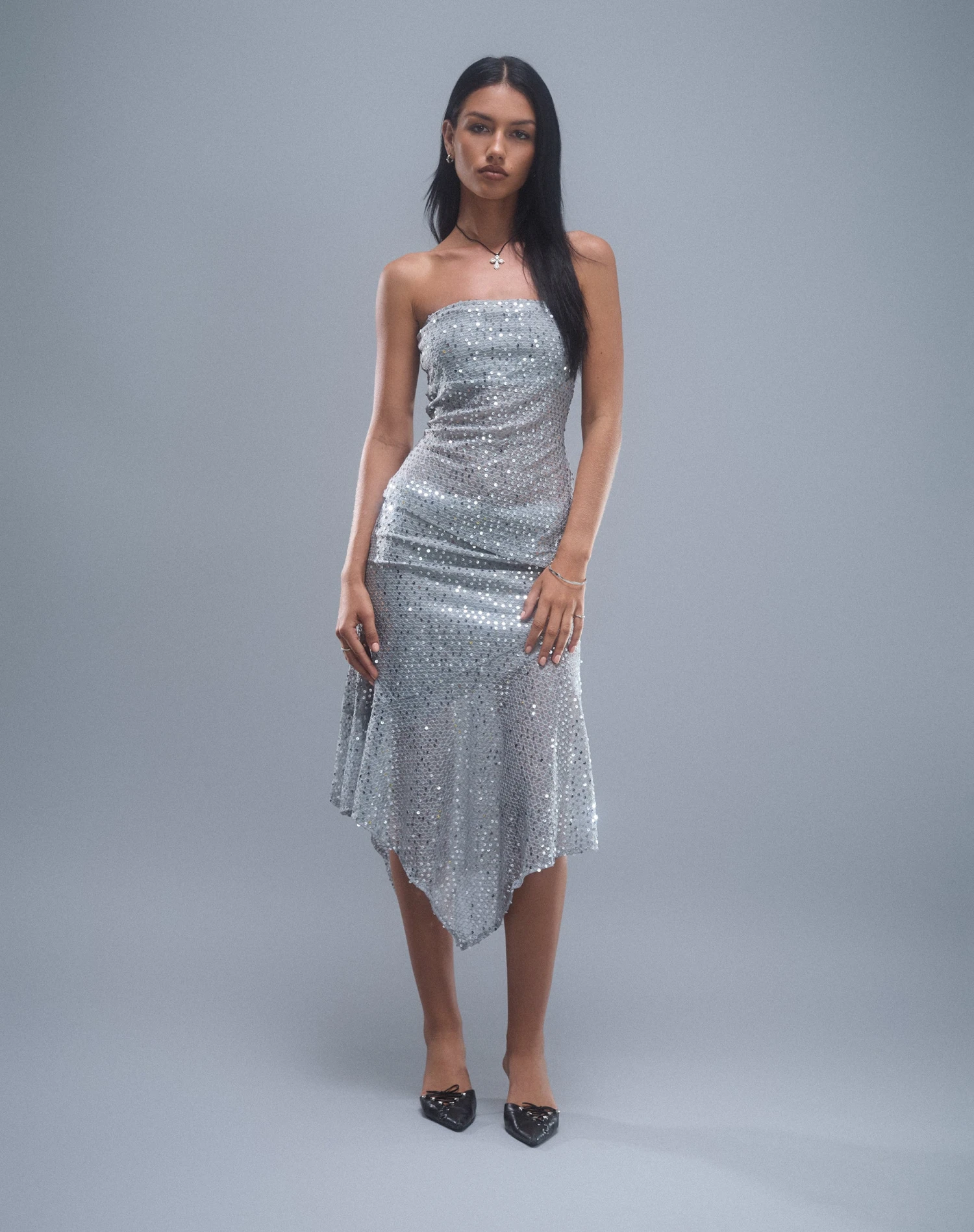 Get the glam look this season. The Carita Skirt comes in a midi fit, an asymmetric hemline in a silver sequin. We love to style with our matching Brilia top.