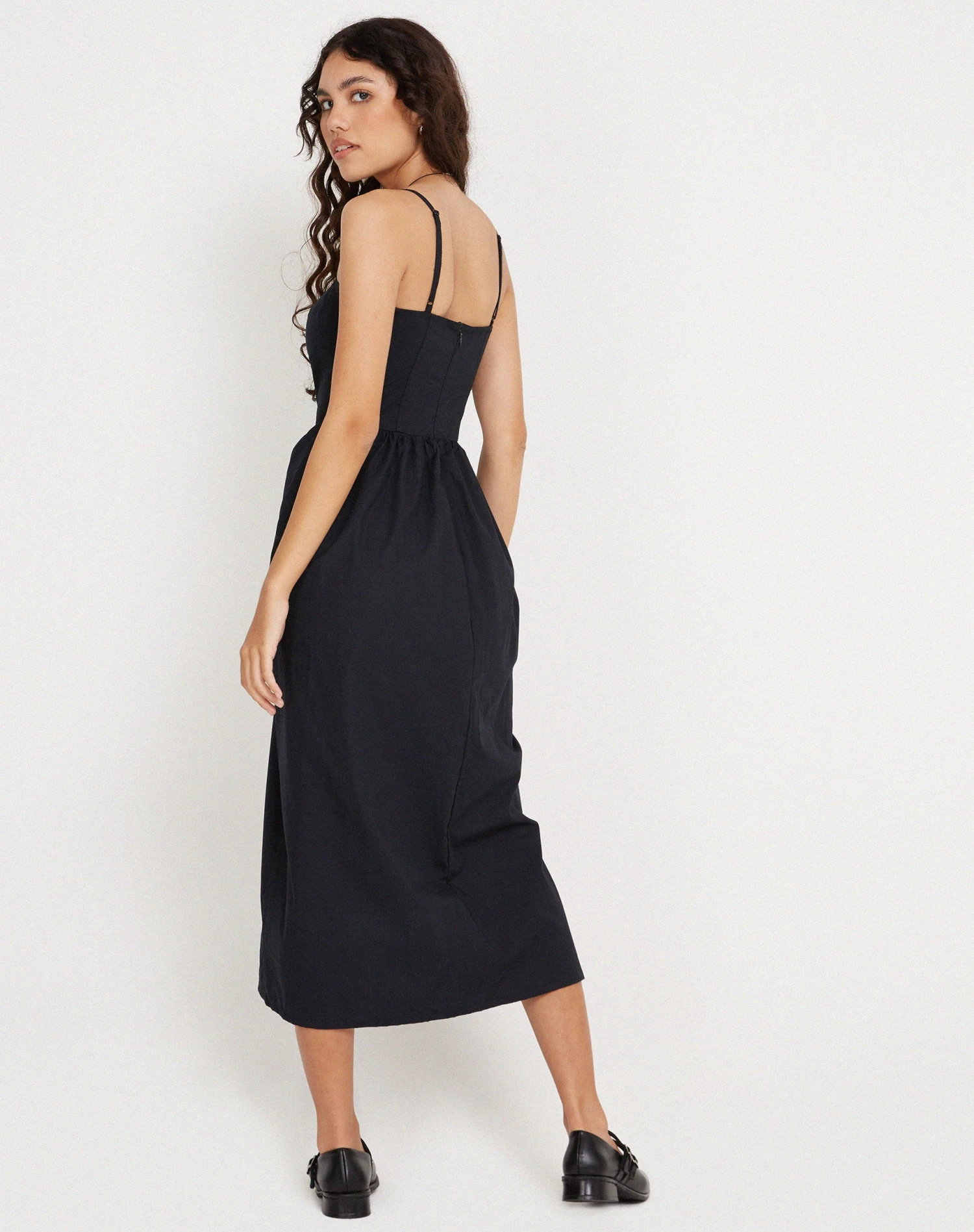 Clementine is a wardrobe must have. Featuring a corset top detailing with a low fitted v waist, thin spaghetti straps and subtle pleating on its mid length skirt. Made from a lightweight cotton poplin it is the perfect transitional season dress!