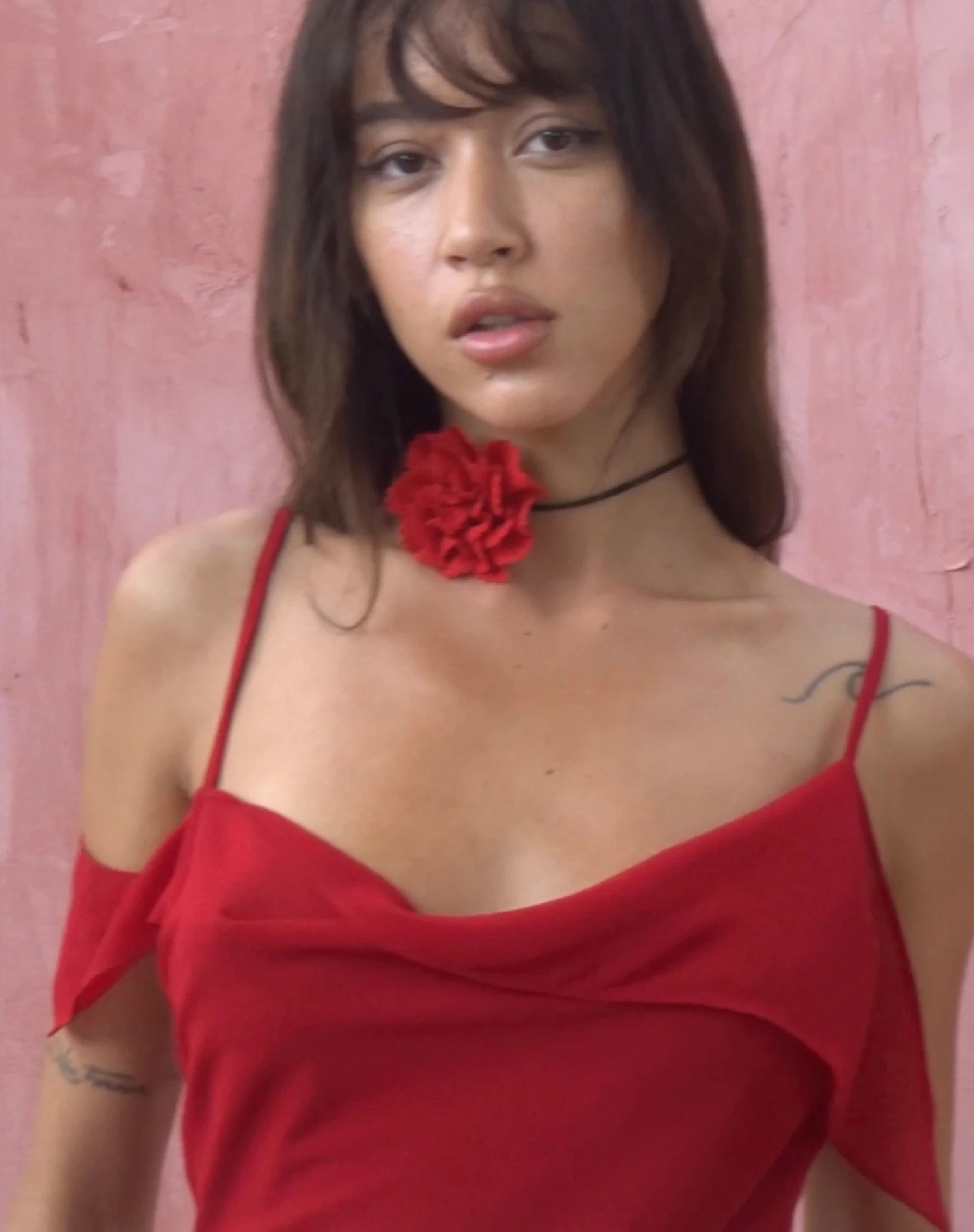 Perfect for those summer nights. The Dansya Dress comes in a flowy, midi length with thin shoulder straps and decorative off-the-shoulder detailing in deep red.