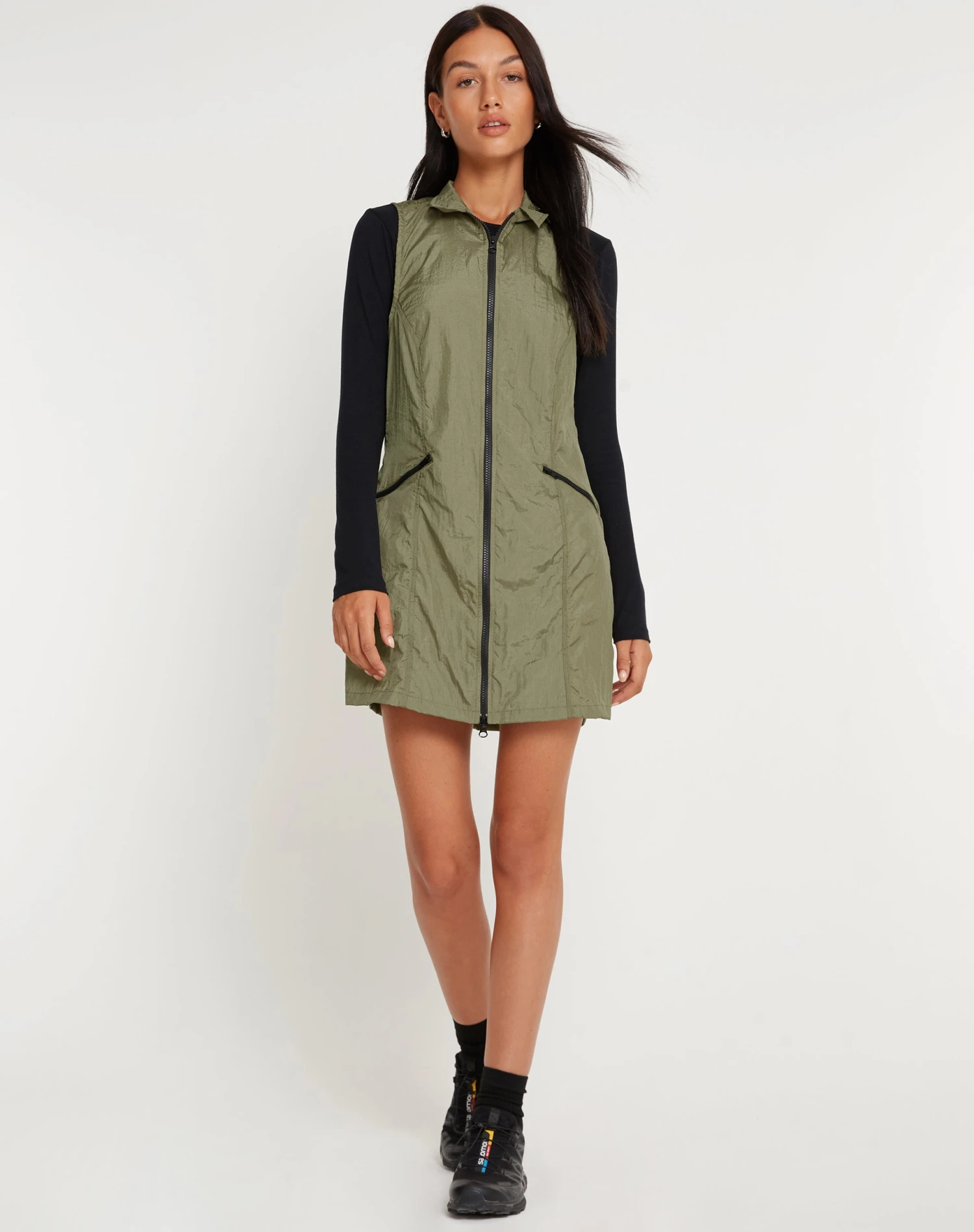 Mini length, sleeveless cargo dress featuring a zip front, winged collar and pockets on the side. We love to layer over the Bonlo top.