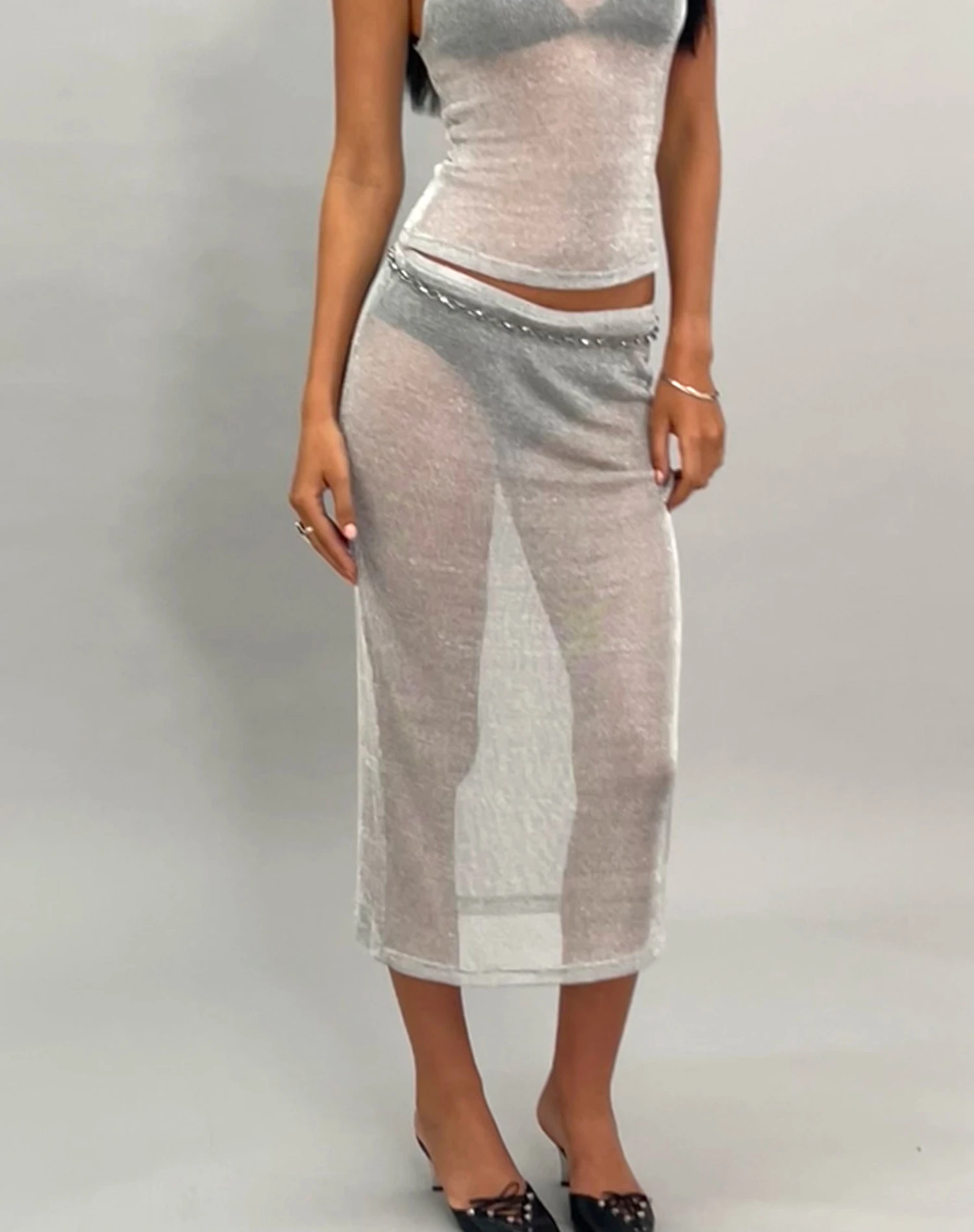 Our favourite silver chain look now comes in a skirt. The Esra comes in a midi length and a low waistline. Pair with the matching Cosima top.