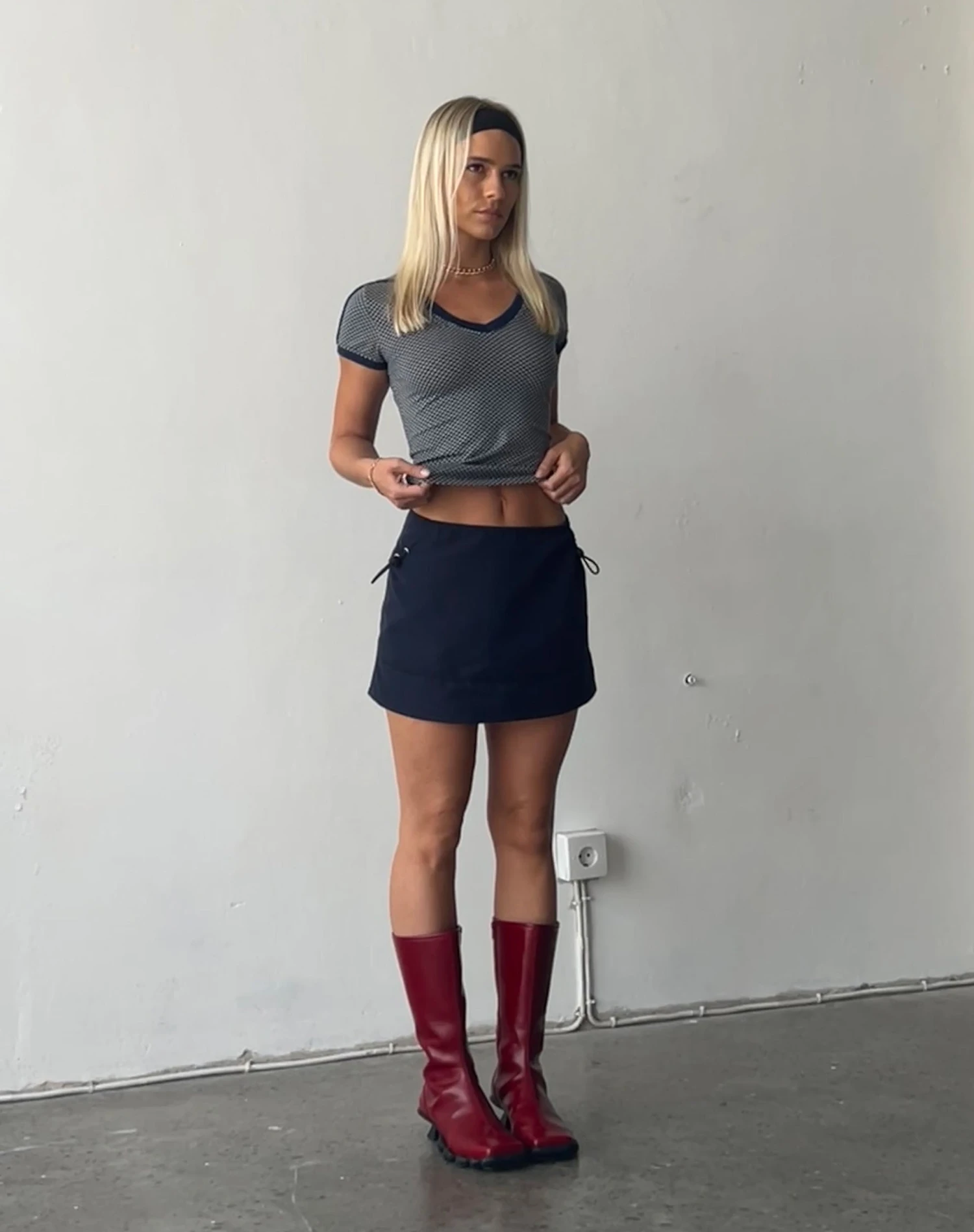 In a navy nylon fabric, our Evy cargo skirt features a regular, mini fit with side pockets and drawstring toggles. Completed with black pipeline detailing. Simply style with our Aus vest top.