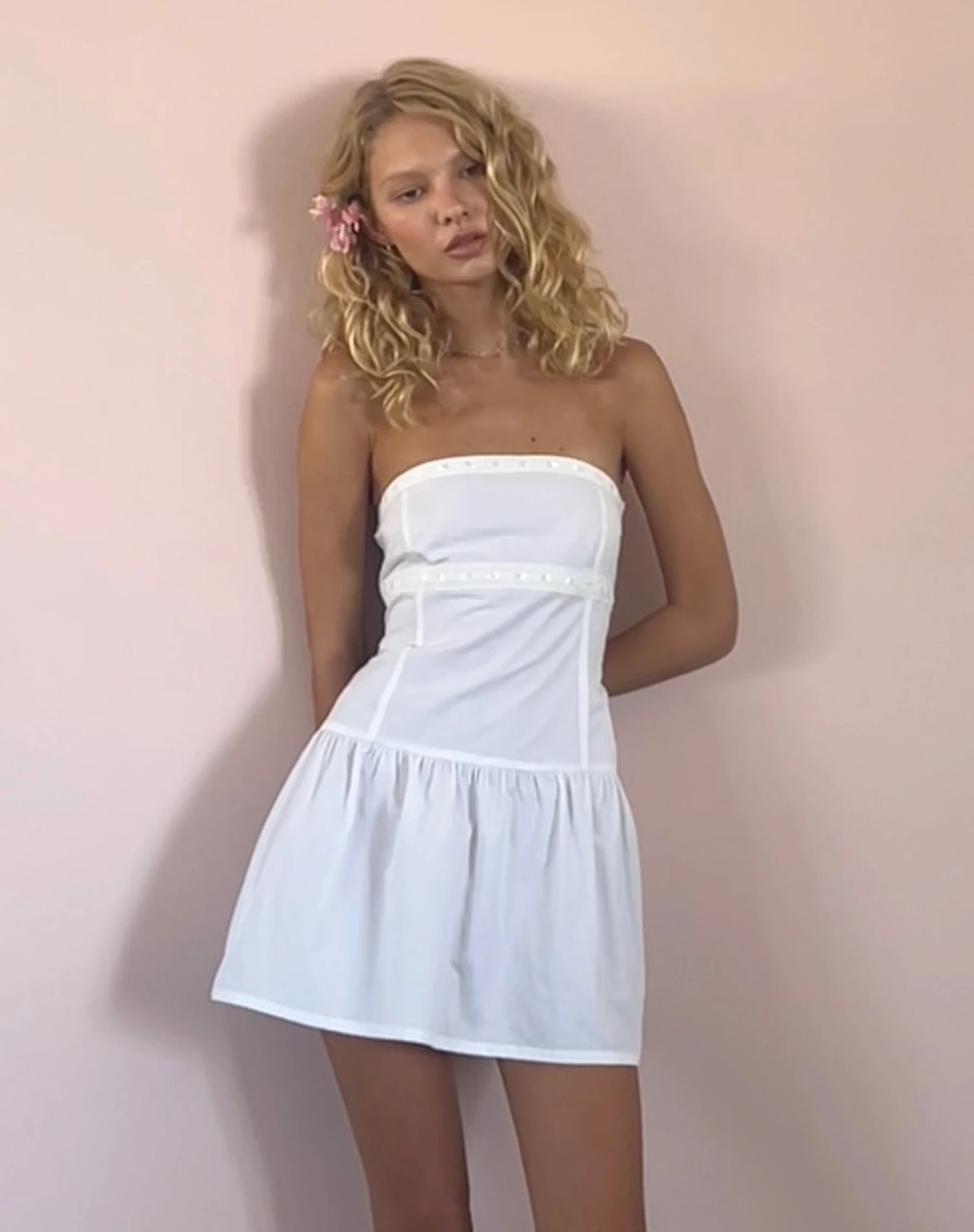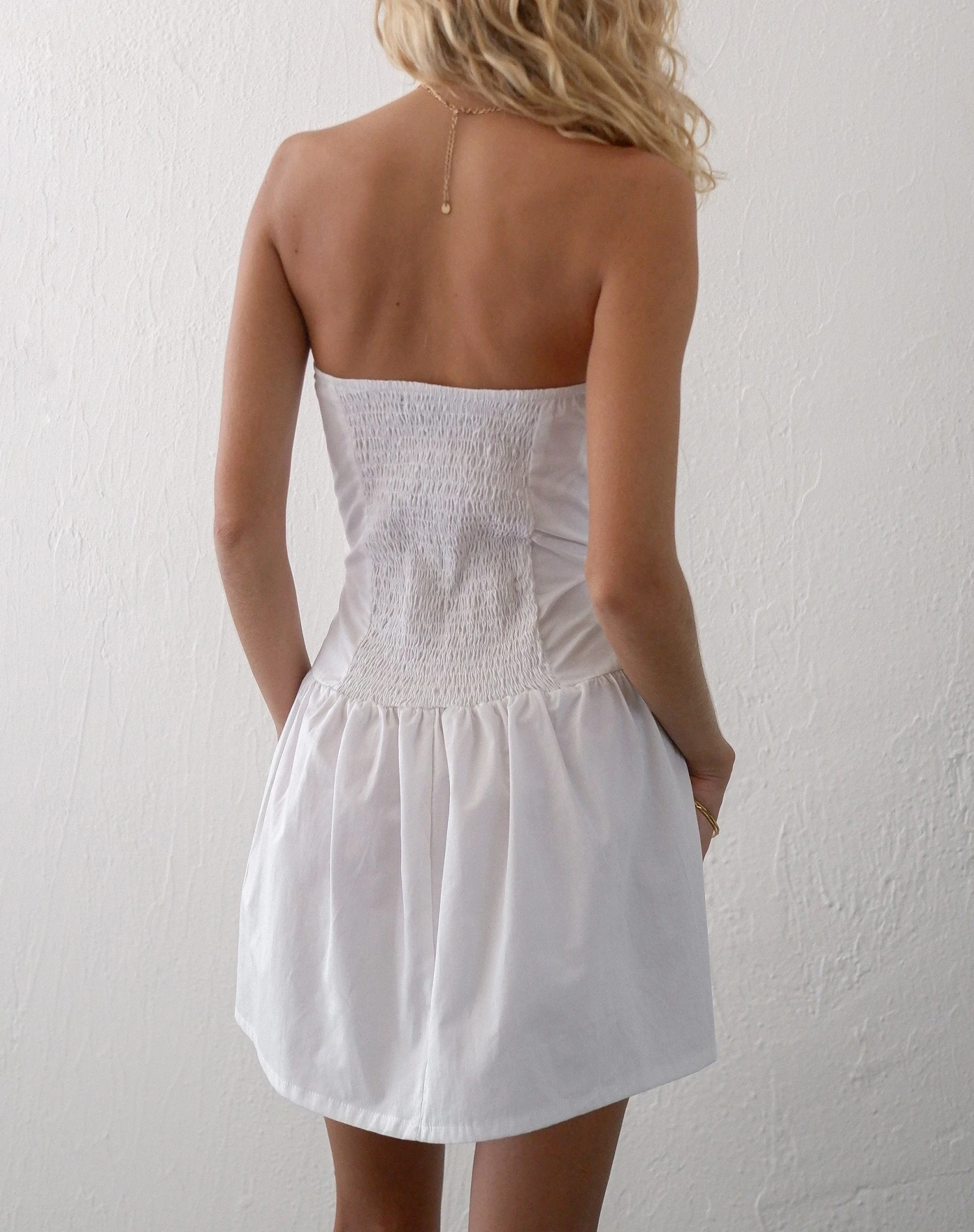 In a white poplin fabric, the Faelyn dress features a sleeveless, bandeau design with a loose, a-line fit that falls mini length and peplum hem with subtle pleating.