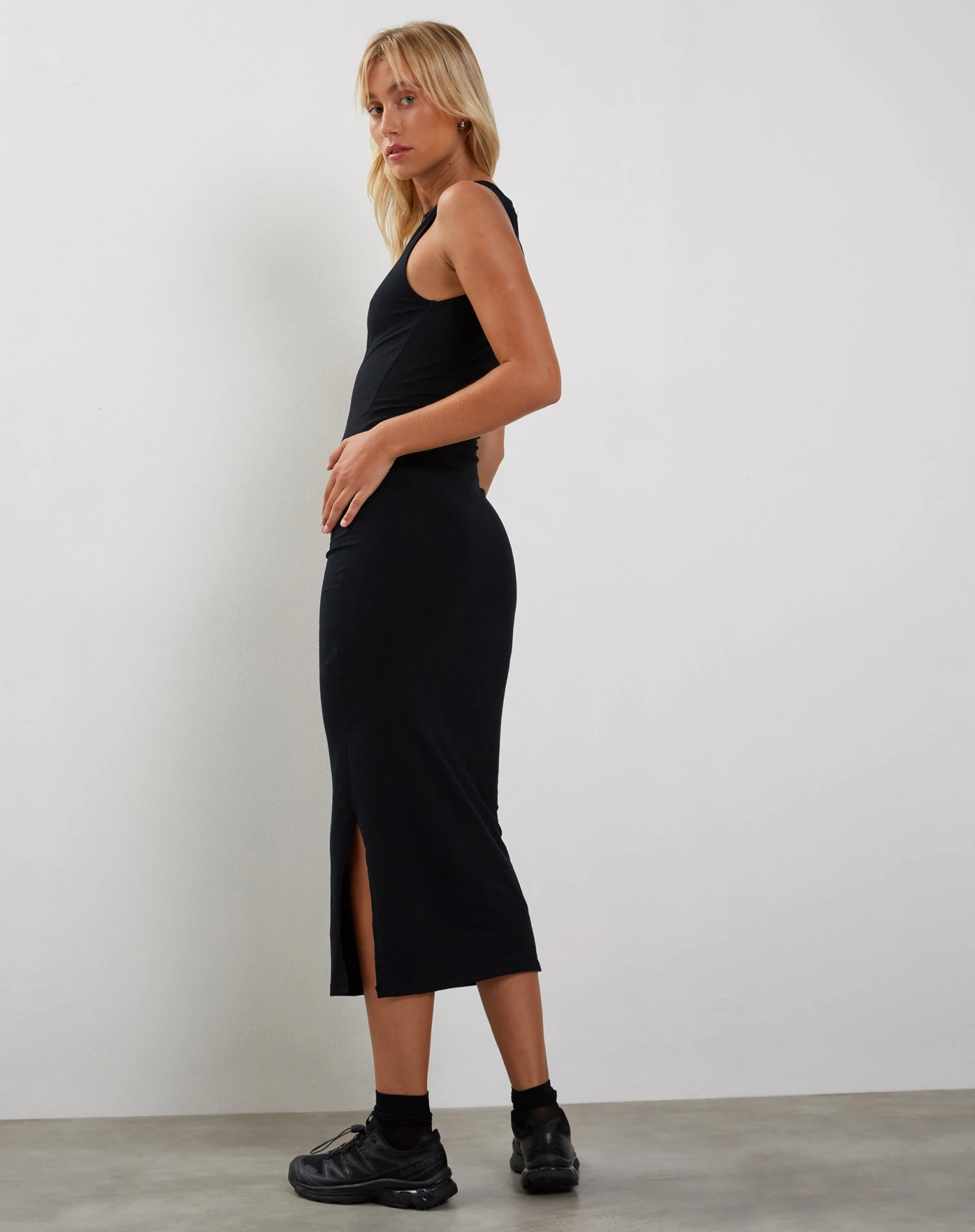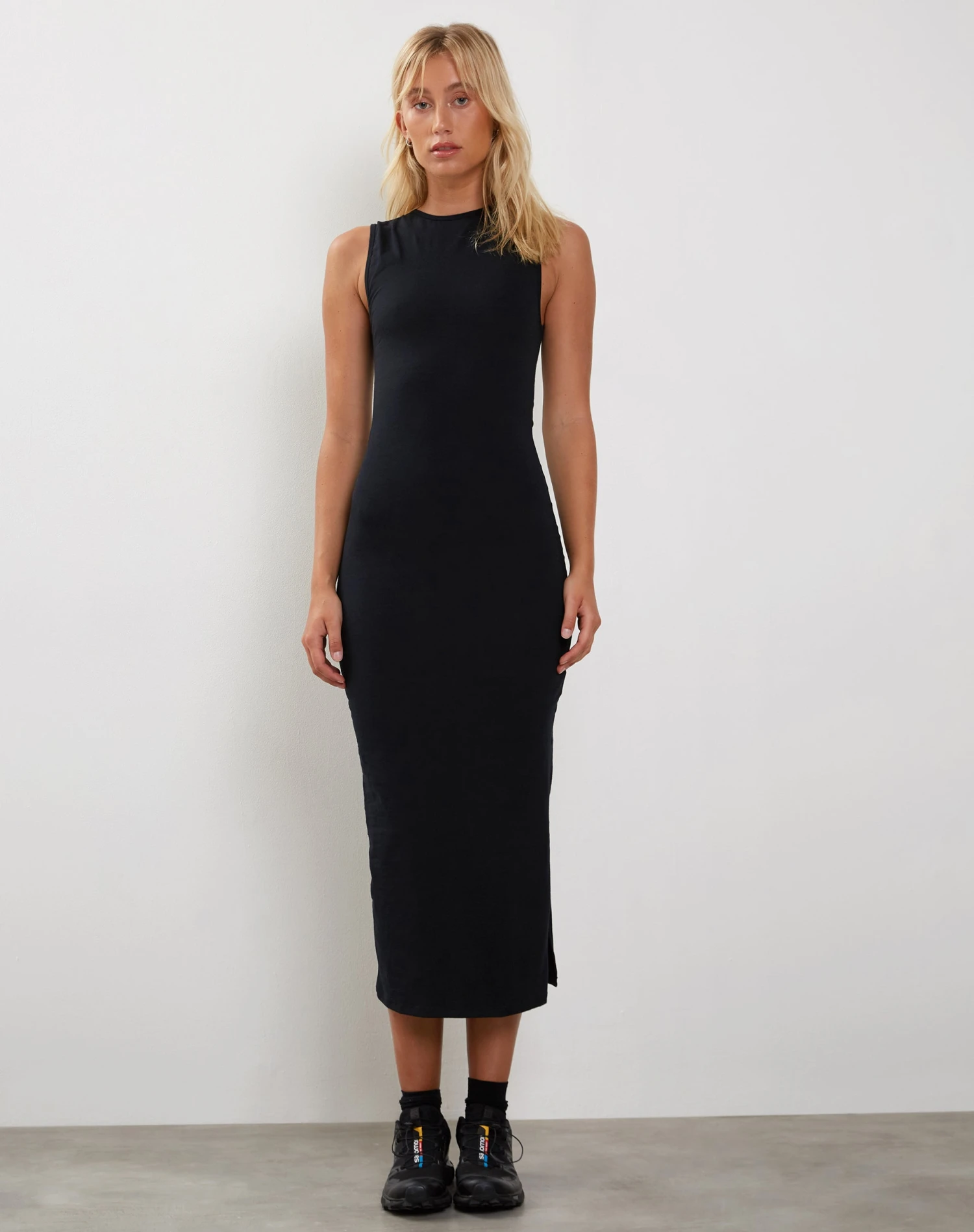 Spruce up your wardrobe with our black Gelena dress. Featuring a midi length, high neckline and a sleeveless design with a subtle leg split.