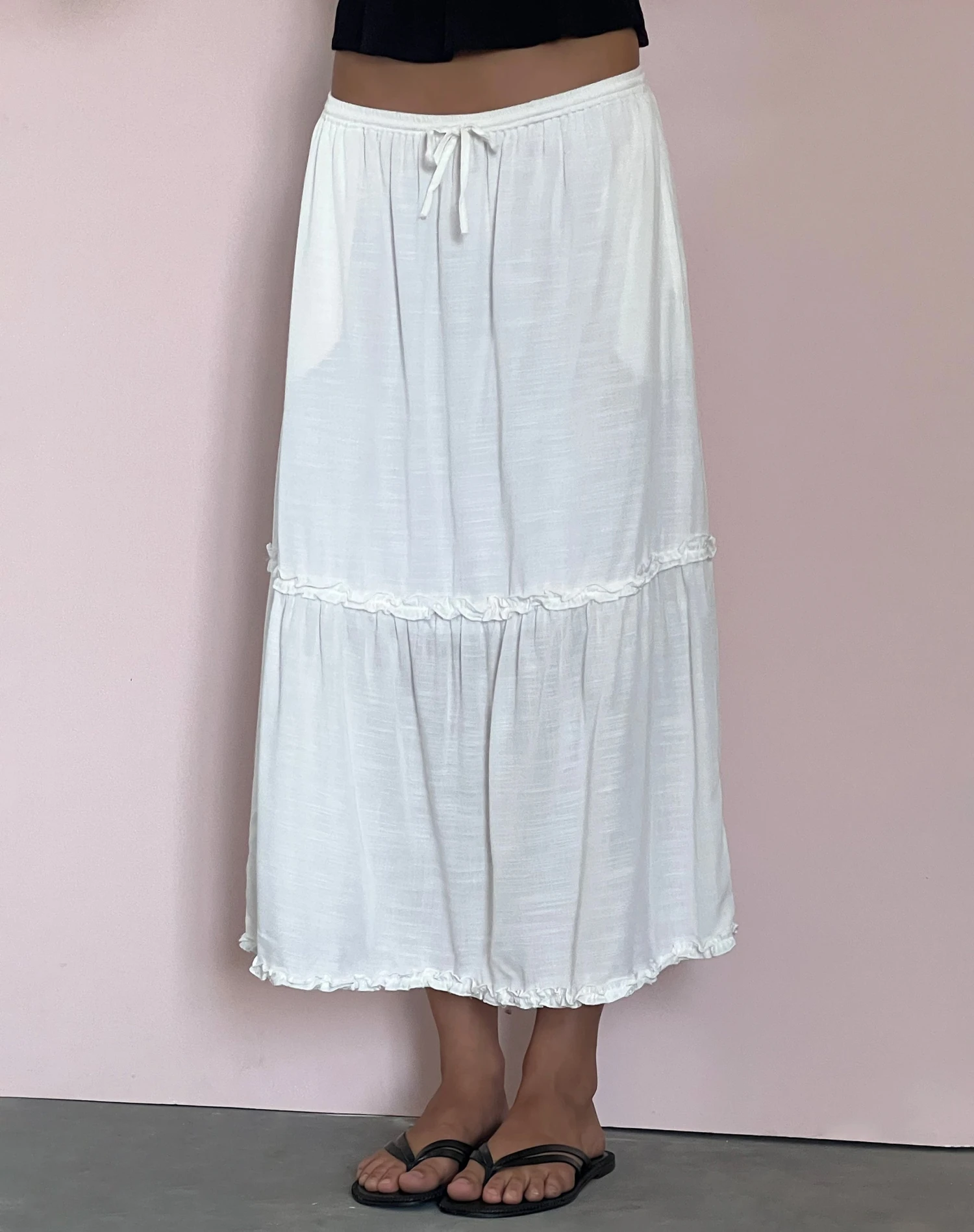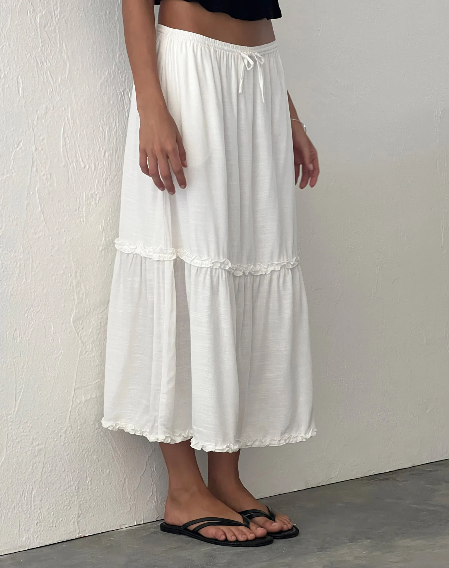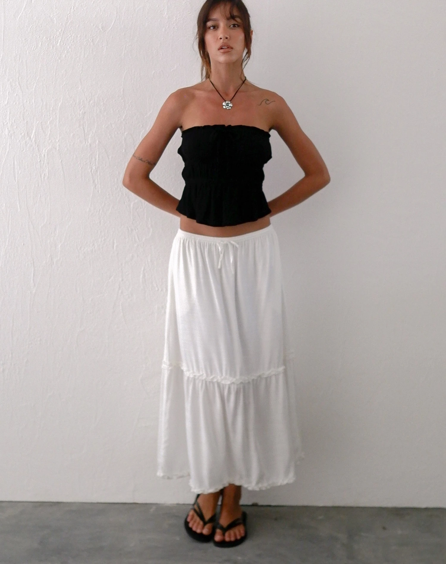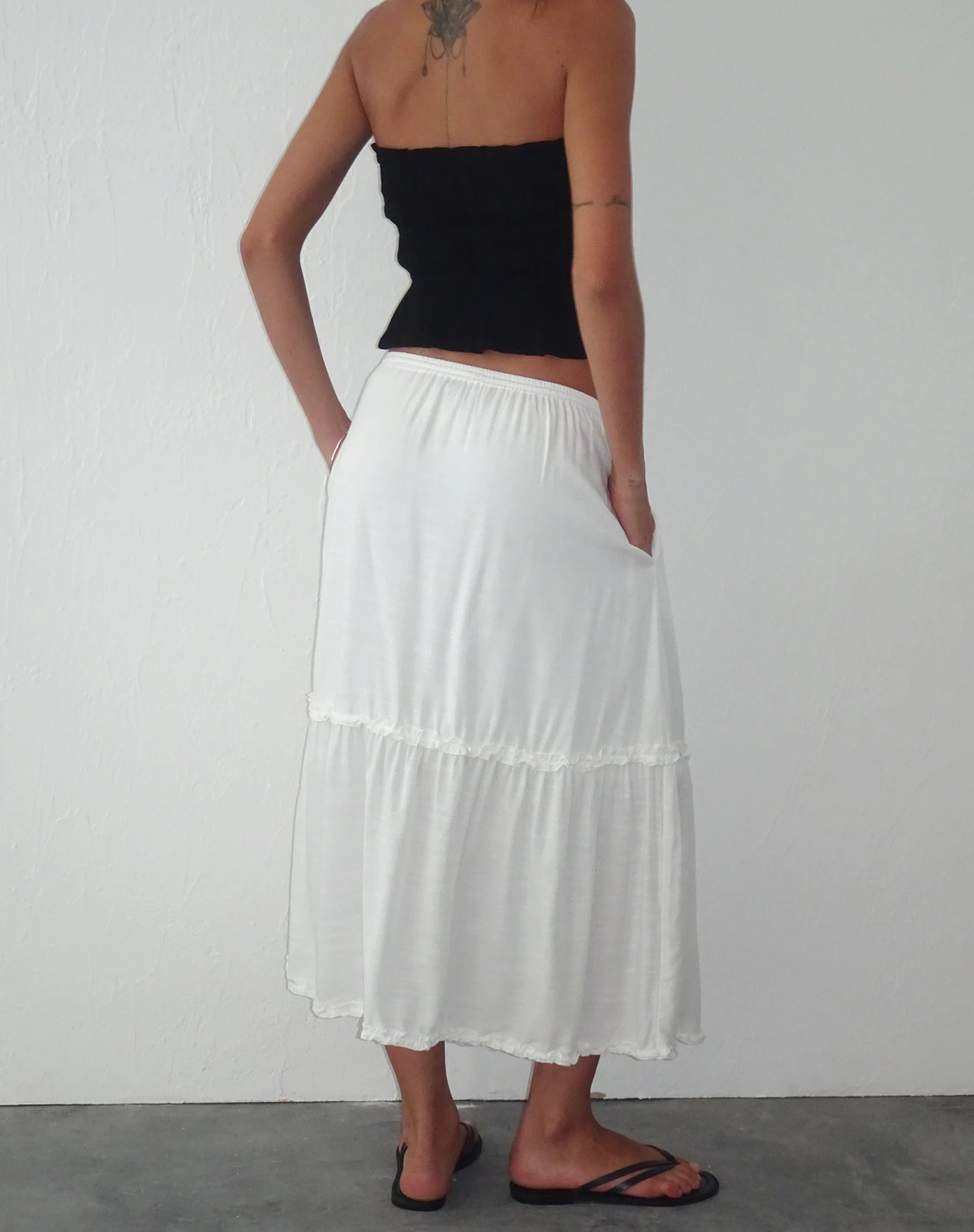 Iyana is a low waisted midi skirt in a tiered design, featuring front ties and comes in an off white colour. We love to wear with our Cove bandeau top.