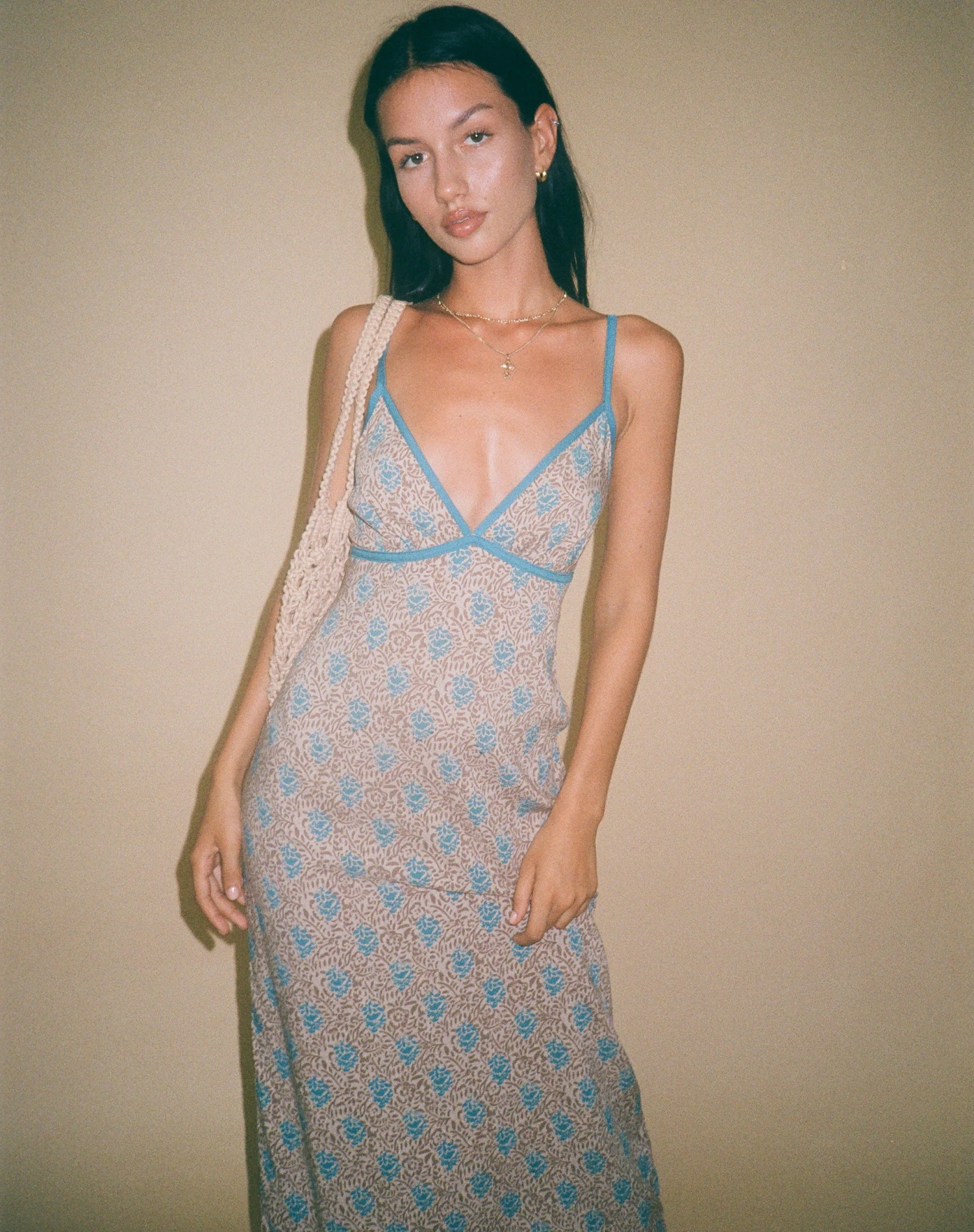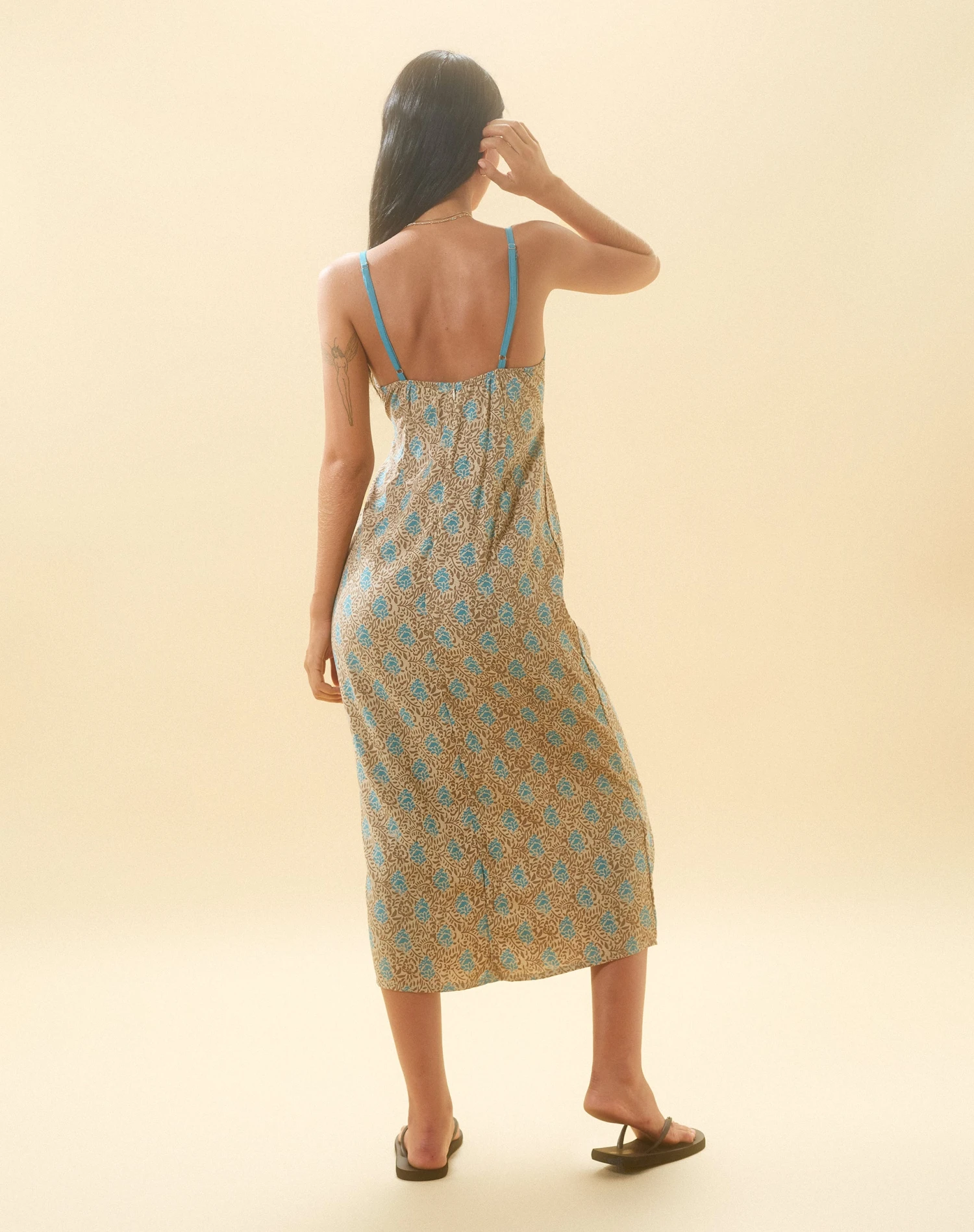 Add some print to your wardrobe with the Lalu dress. Featuring a loose, midi fit with thin, cami straps and a V neckline with blue lace detailing around cups. Detailed with a repeat paisley print.
