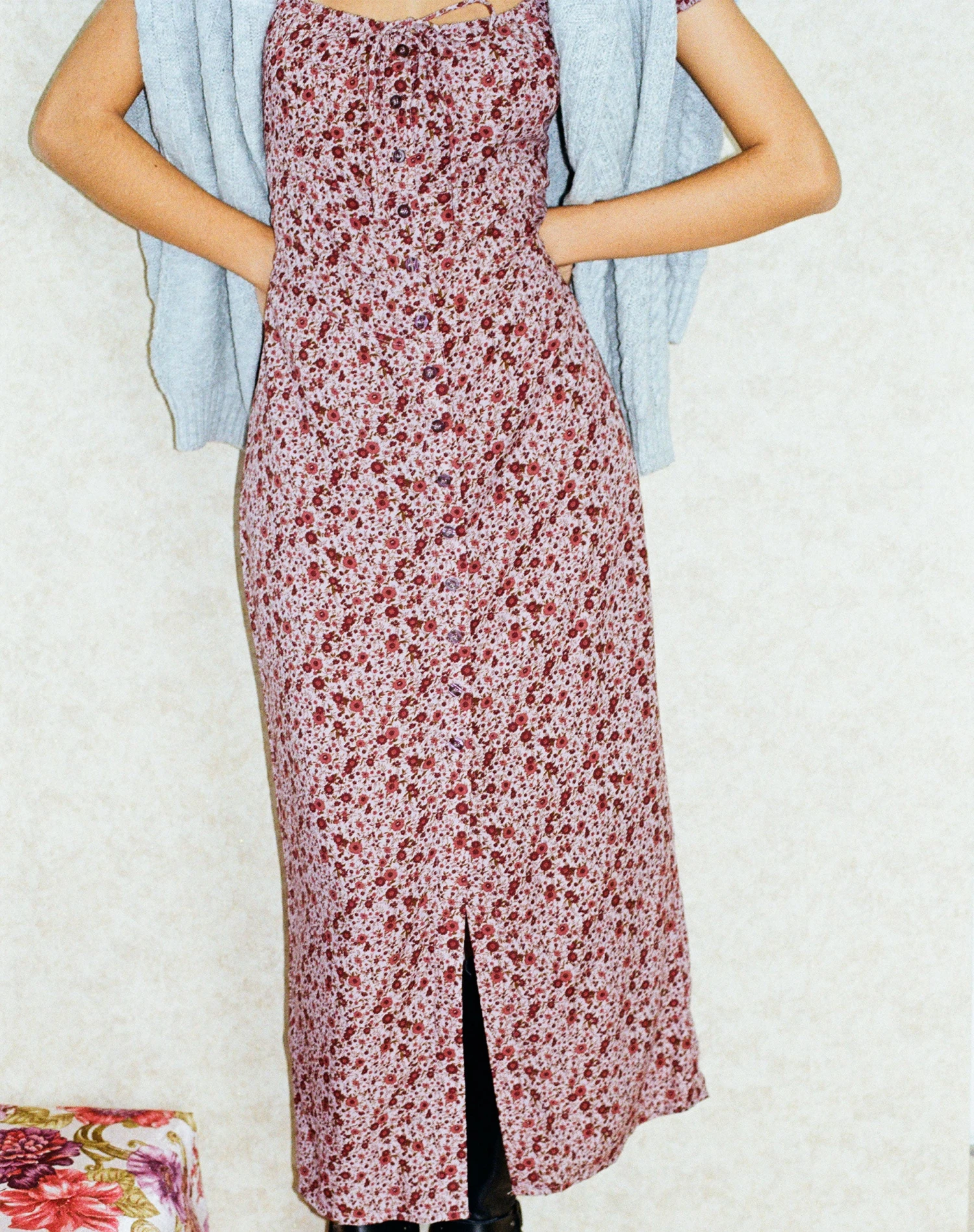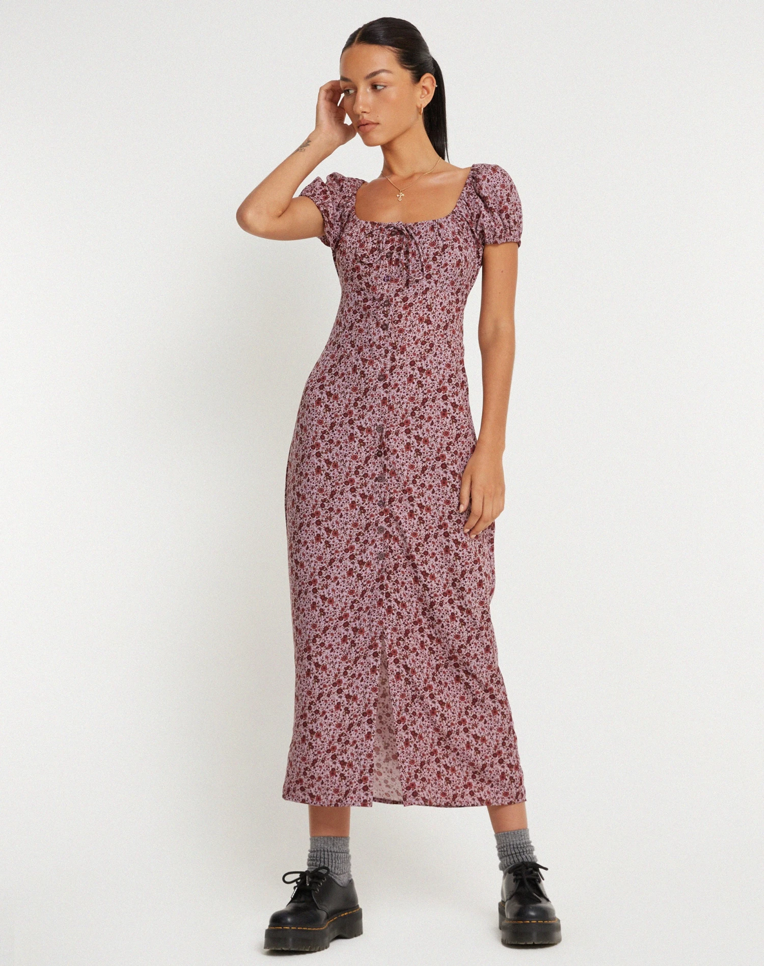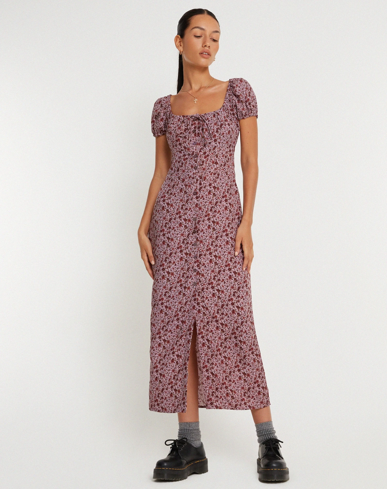 The Larson dress is ideal for day activities. In 90’s floral burgundy, it features a midi, a-line fit with a square neckline and short sleeves.