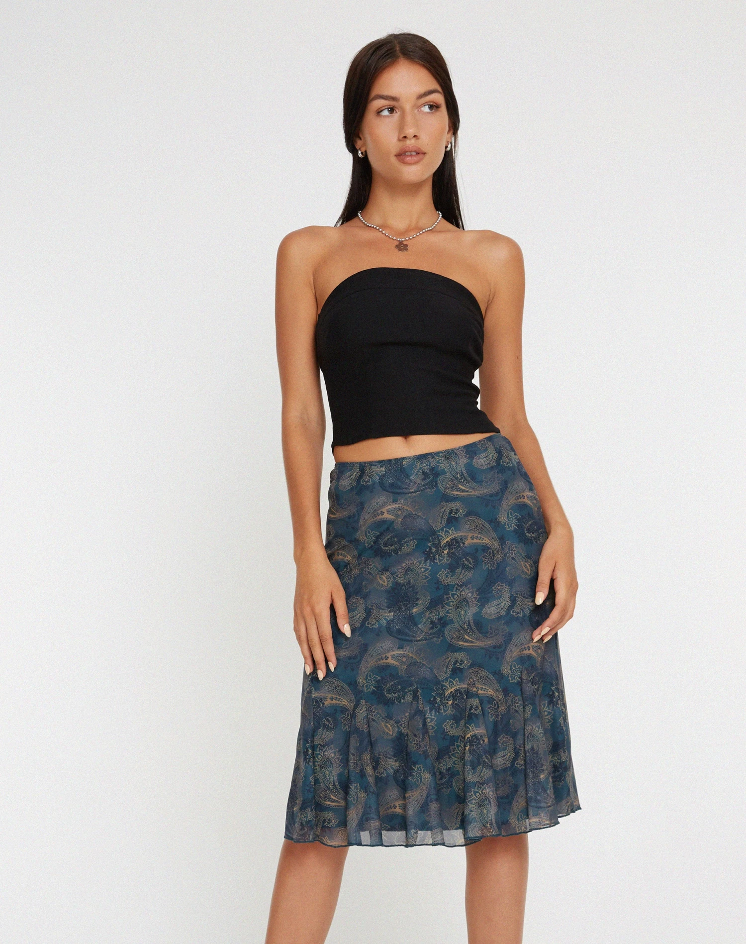 Mesh midi skirt featuring a frill hem detail in tonal blue paisley print. Pair with our Shae Bandeau for a laid back ‘fit.