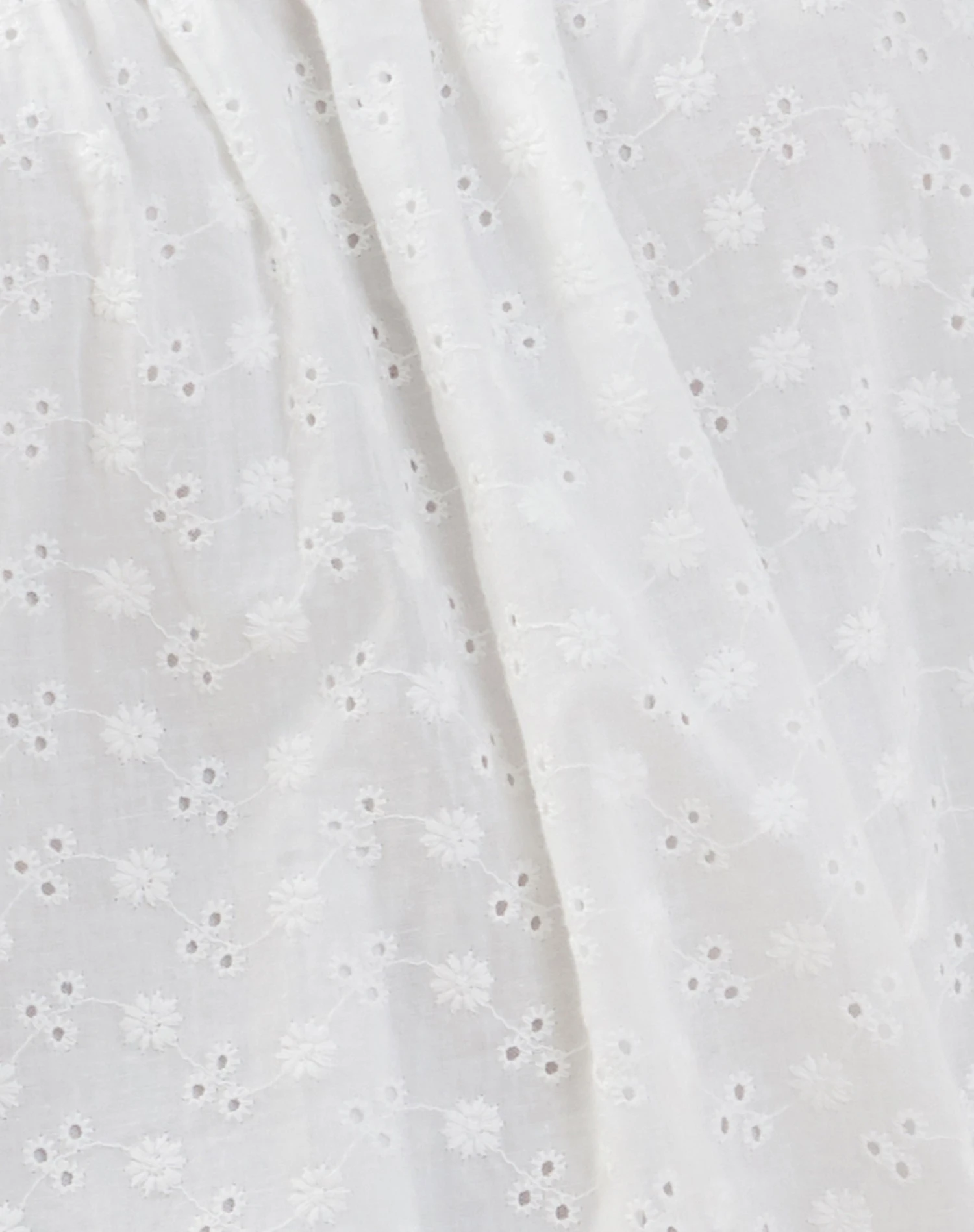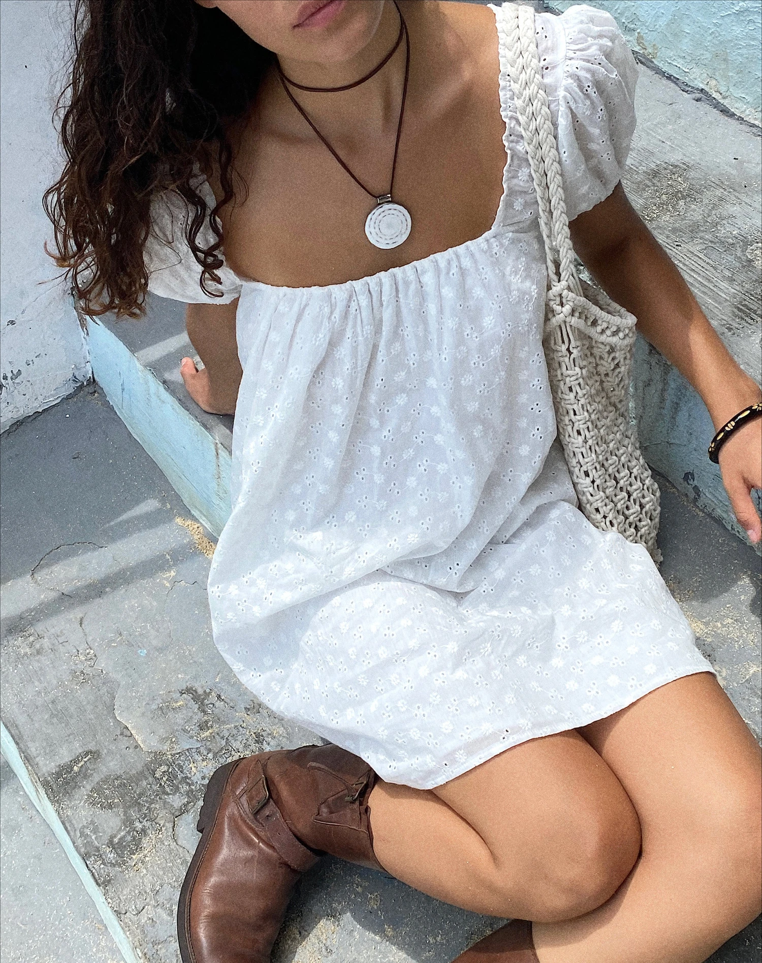 Broderie is back! In a white embroidered fabric, the Leyona baby-doll dress features puff cap sleeves with a gathering square neckline and a-line mini fit.