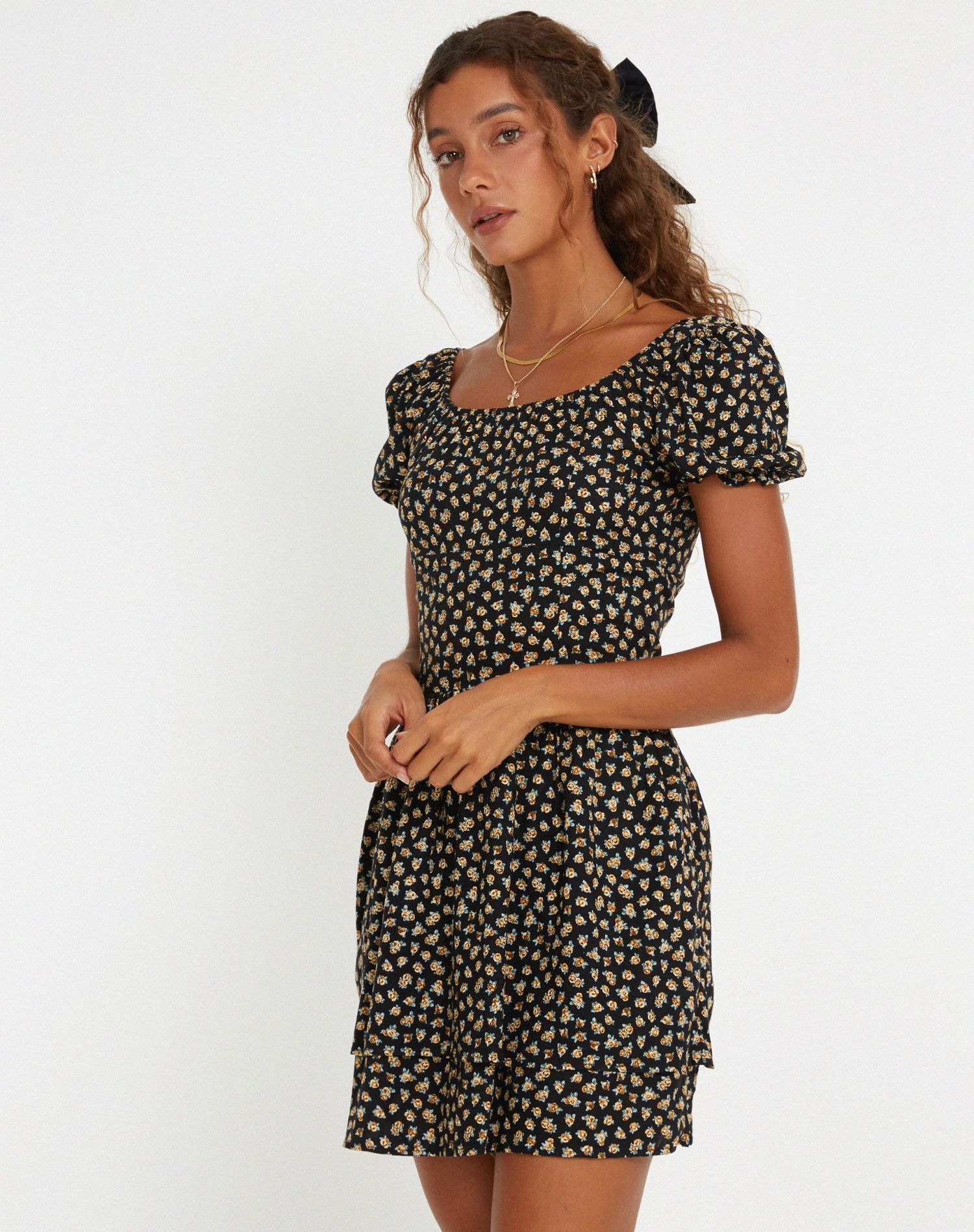 Elevate your day dresses with the Lilibeth. In a ditsy print, it features a mini, bodycon fit with a square neckline and puff sleeves. Style with some rodeo boots to complete this trendy fit.