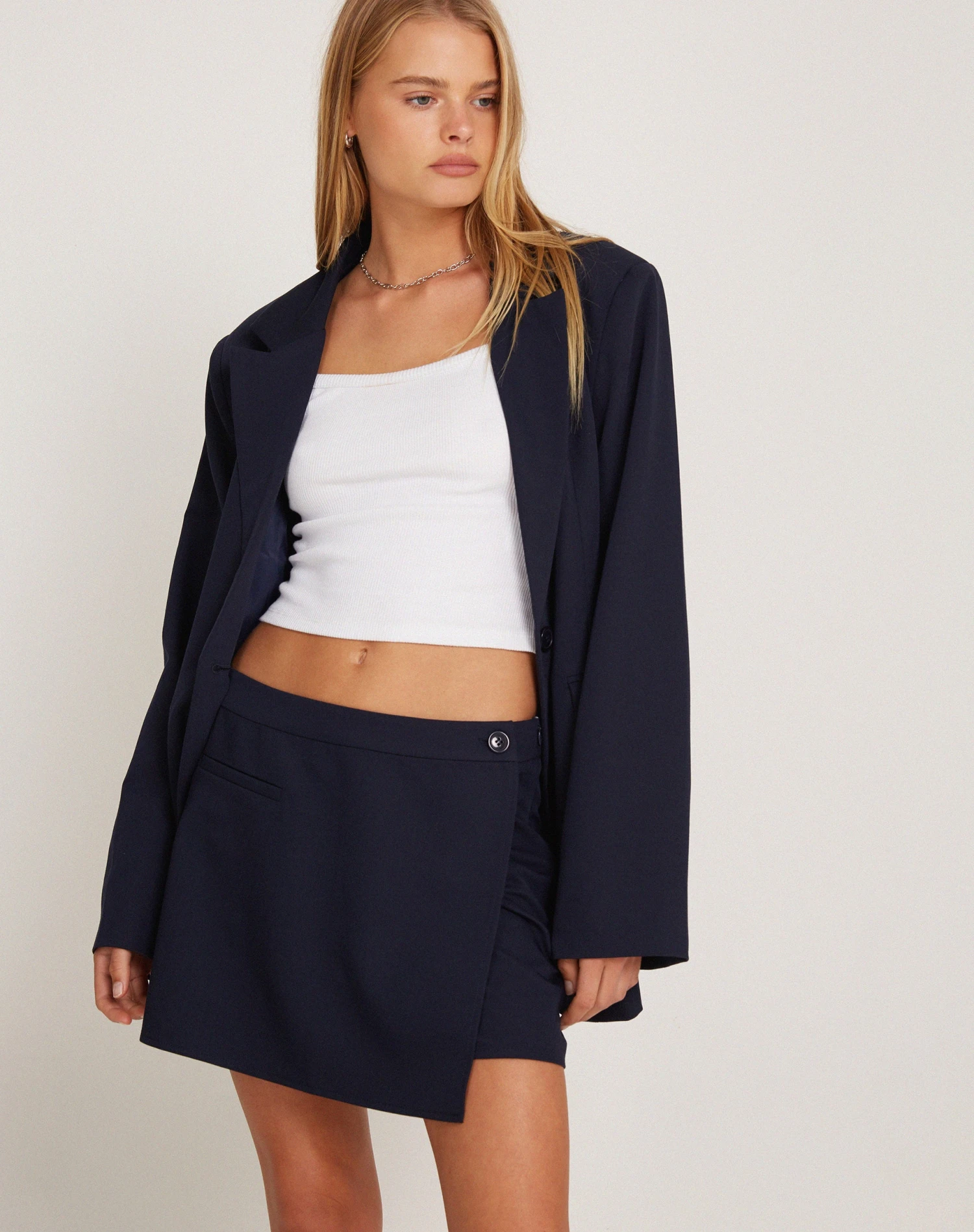 Style up your wardrobe with our lolana skort, with a low rise design and tailored mini fit. Featuring a wrap style skirt on front with shorts fit underneath, with an illusion pocket design in navy. We like to pair with our Aus vest.