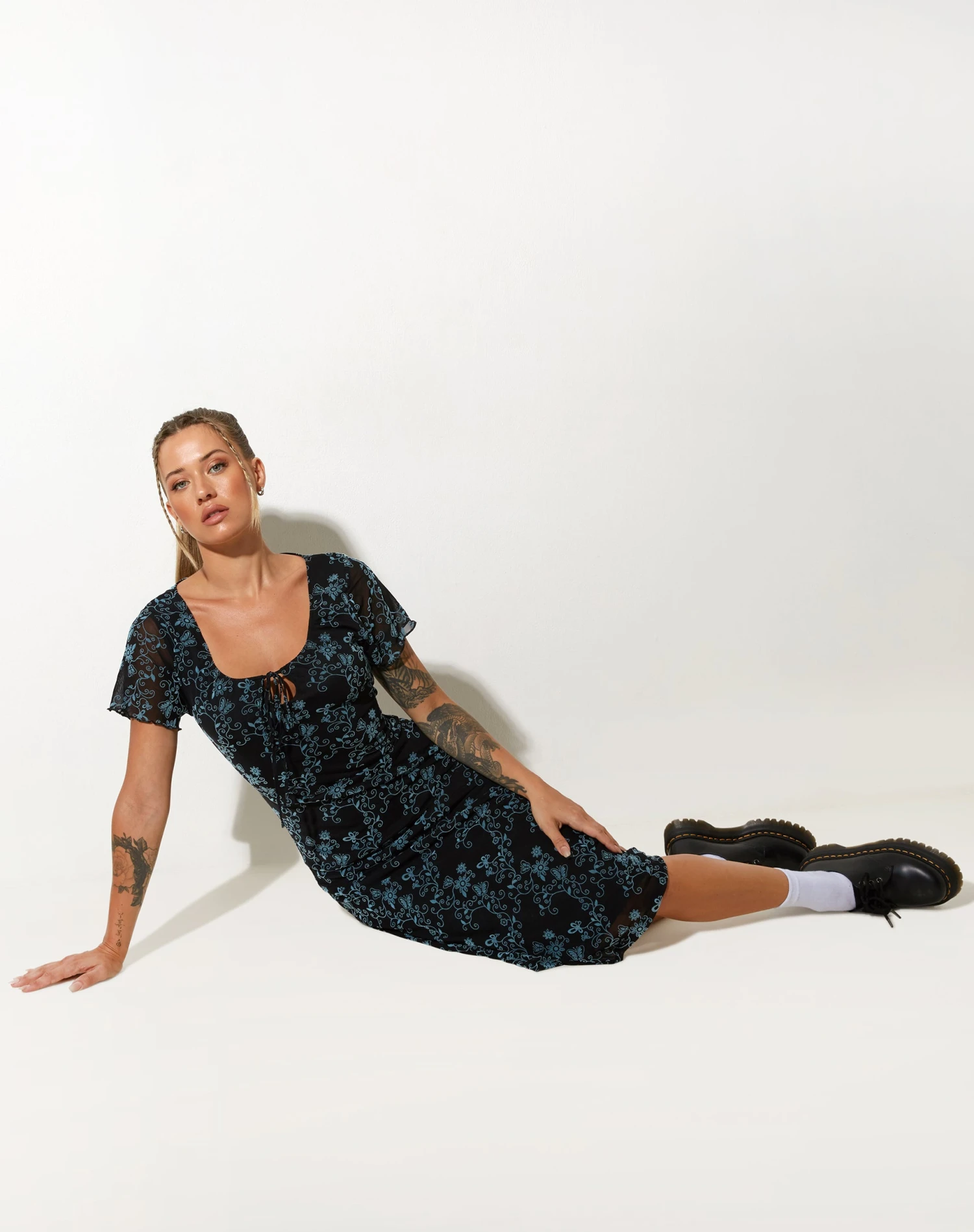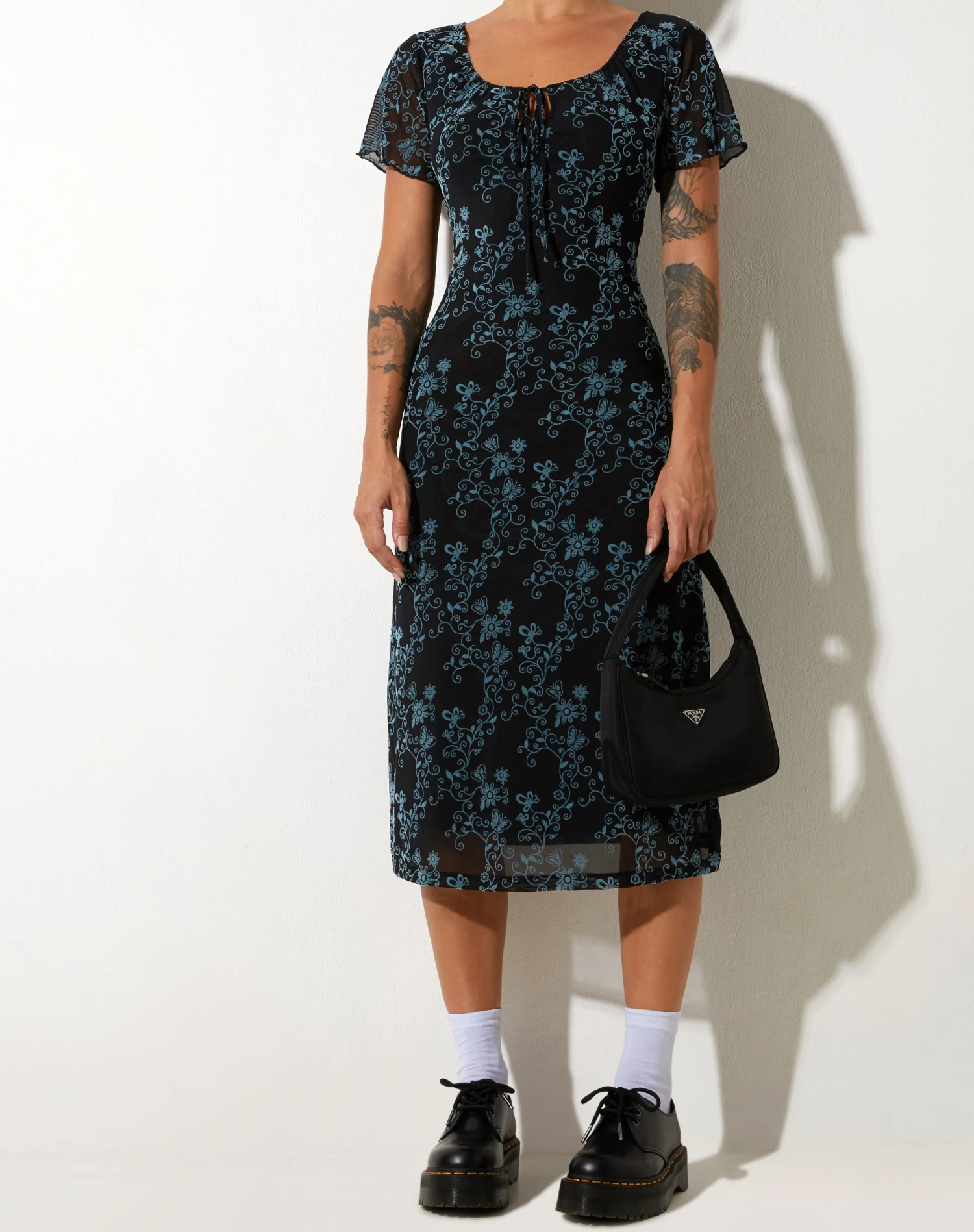 For your new midi dress go-to, opt for the Lorani dress. In a blue and black butterfly print, it features a longline midi fit with a scoop neckline, tie up detailing and short sleeve design. Pair with some chunky loafers and socks.