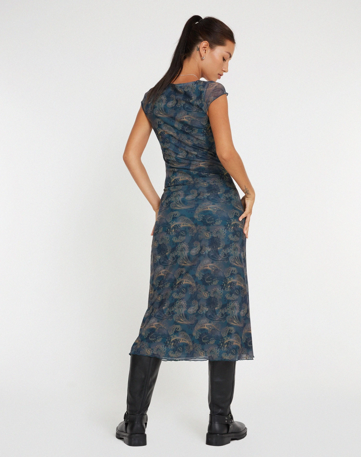 Mesh midi dress featuring tie neck detail and delicate cap sleeves in tonal blue paisley.