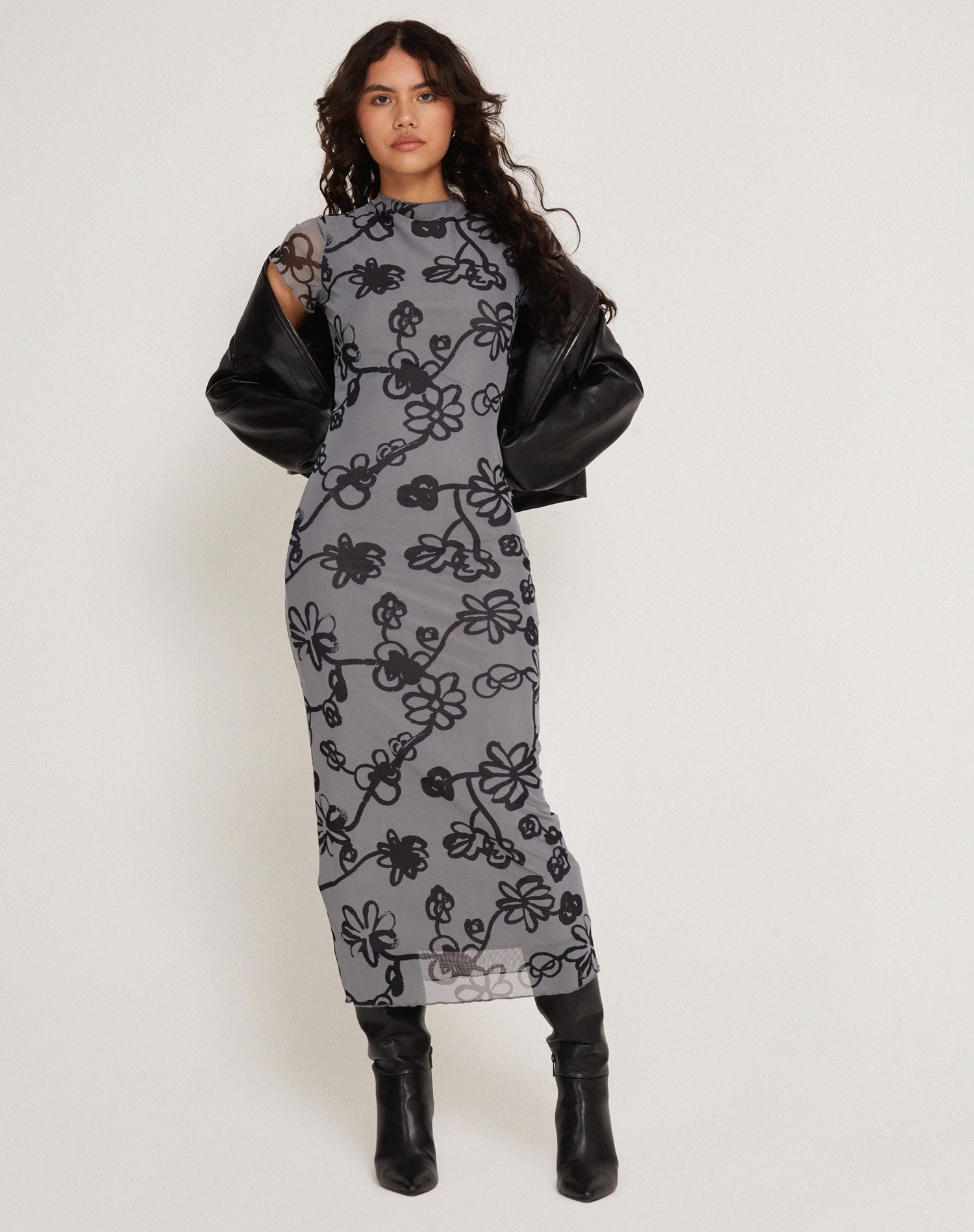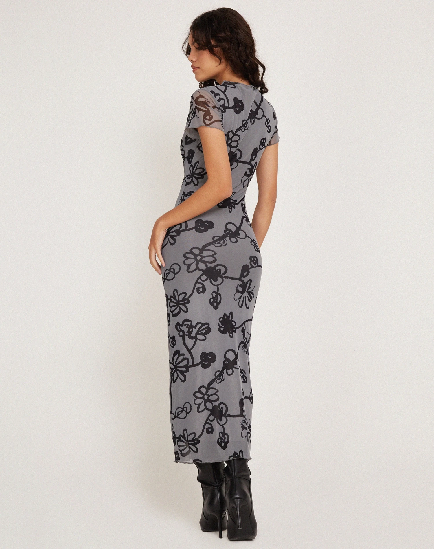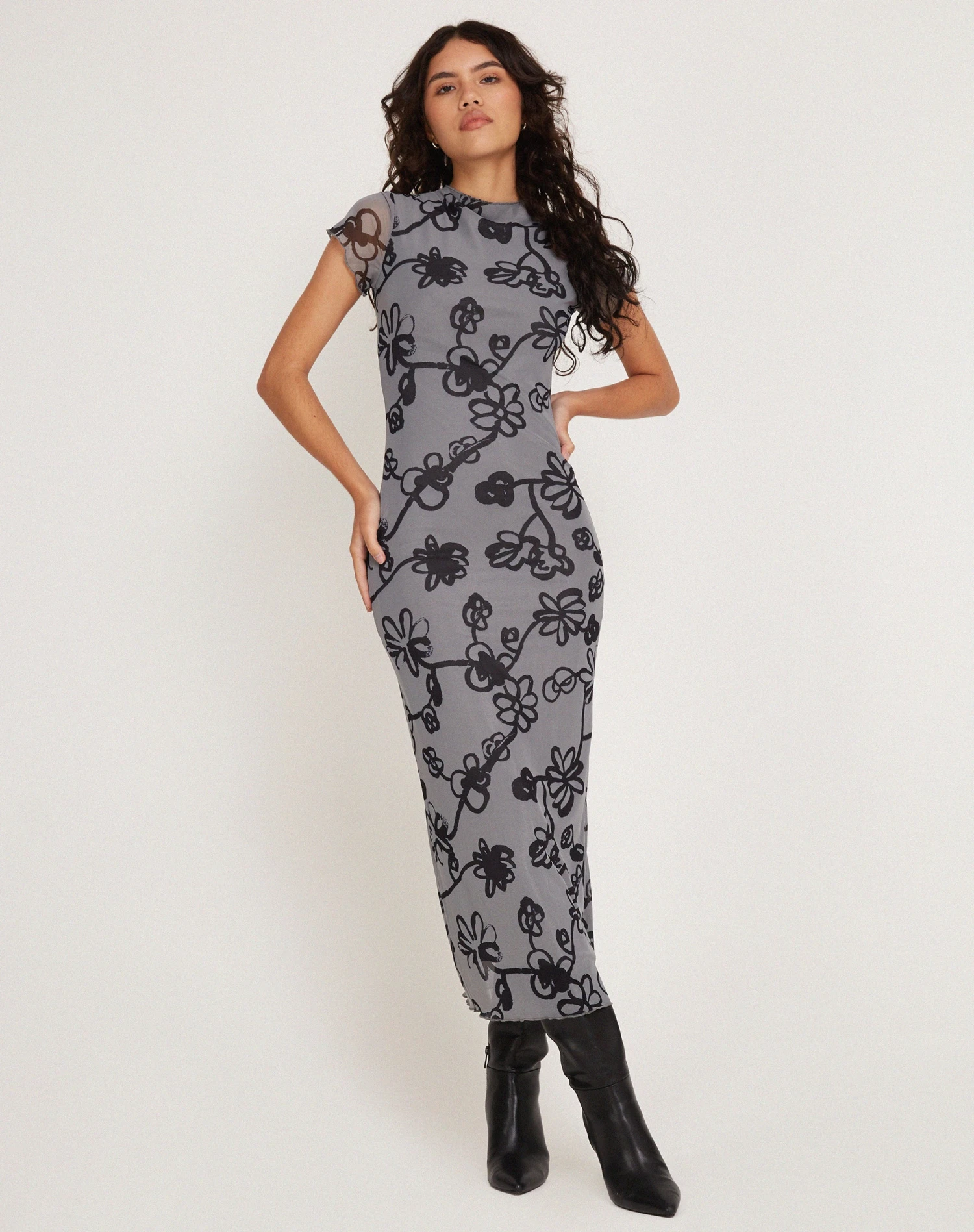 In a grey mesh fabric, our Maruza dress features a slim, midi fit with short sheer sleeves and a high neckline. Detailed with an all-over doodle flower print.