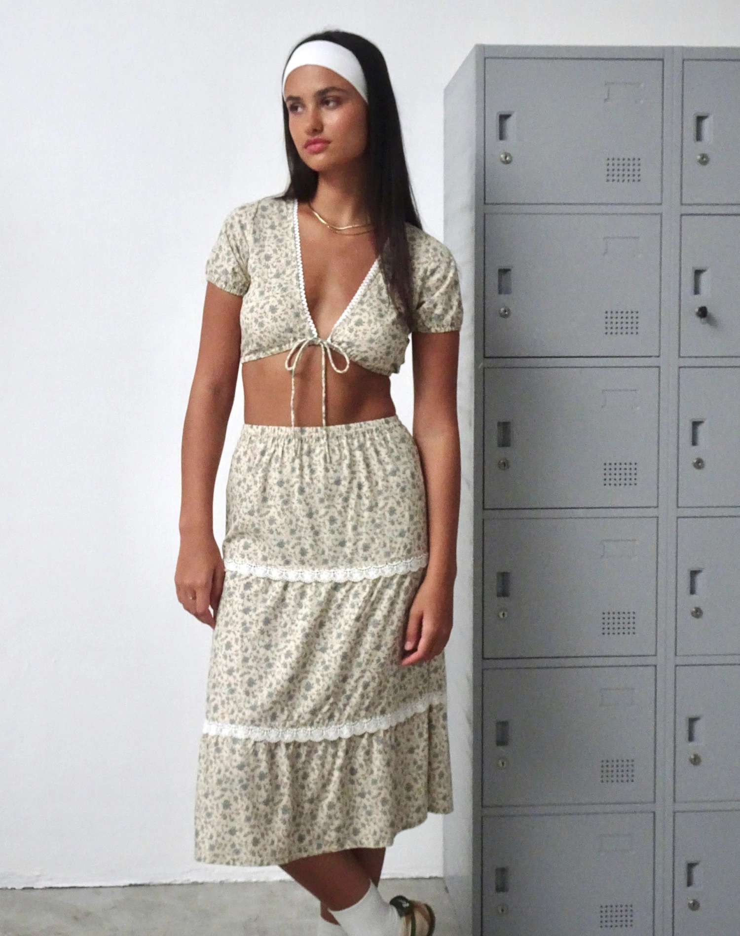 Low waisted, tiered midaxi skirt in a lightweight viscose with printed ditsy blue flowers on an off white base featuring 2 frill panels. Get the look with the matching Skise top.Â