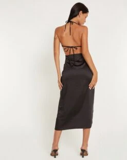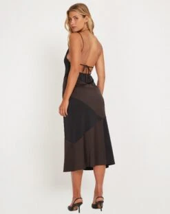 A must have beach cover up! The Maysa halterneck midi dress features a cowl neck with adjustable ties in a mesh coffee brown with oval bead detailing. Style over a bikini set and be summer ready.