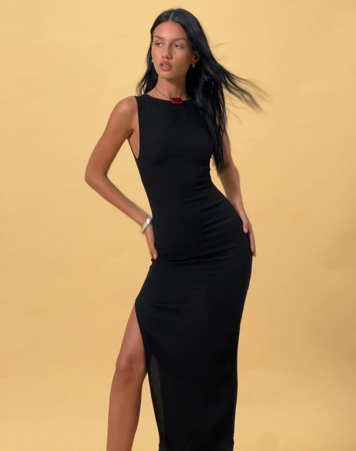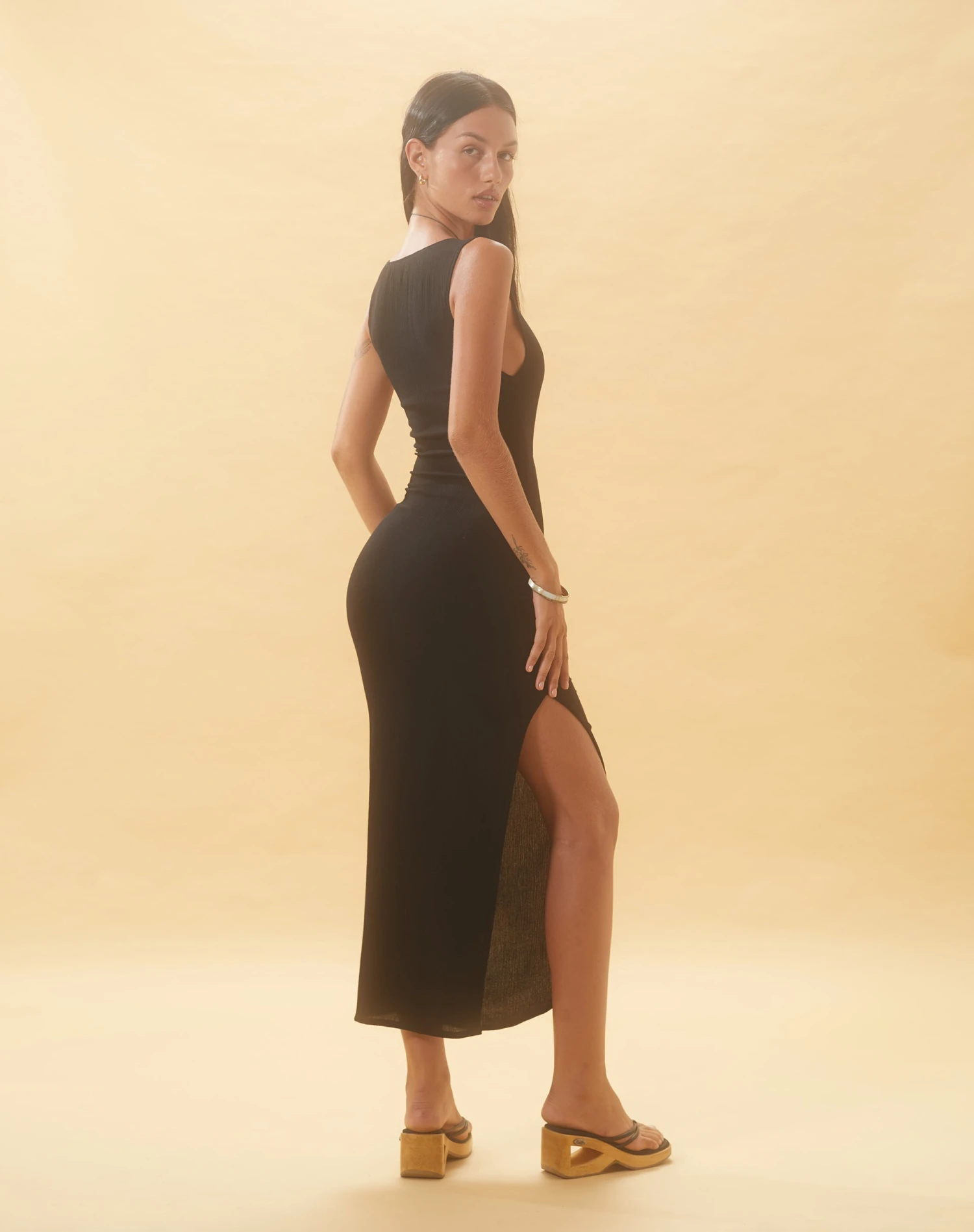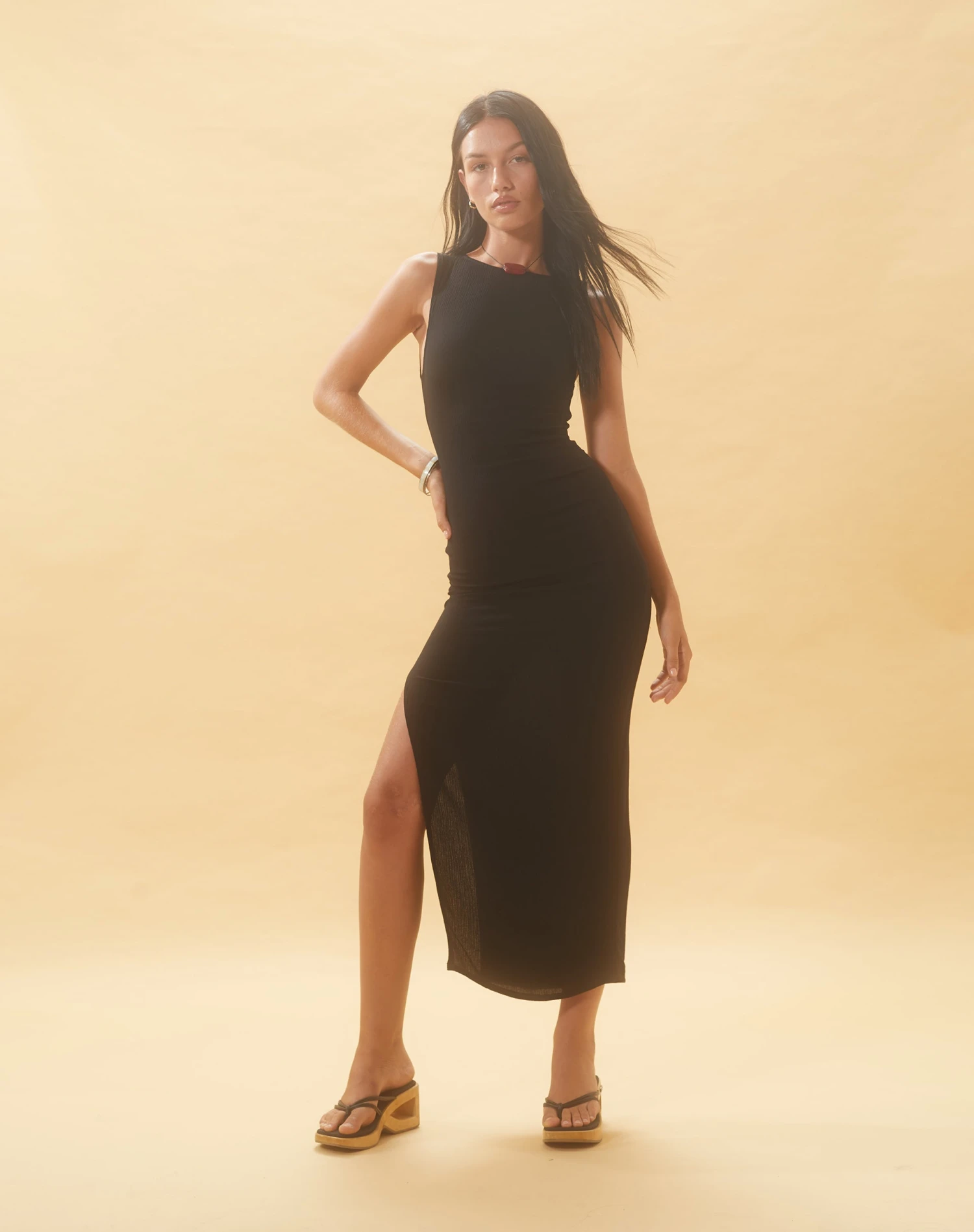 The perfect day to night dress. Our Minyo maxi dress features a high racer neckline in a bodycon crinkle black.