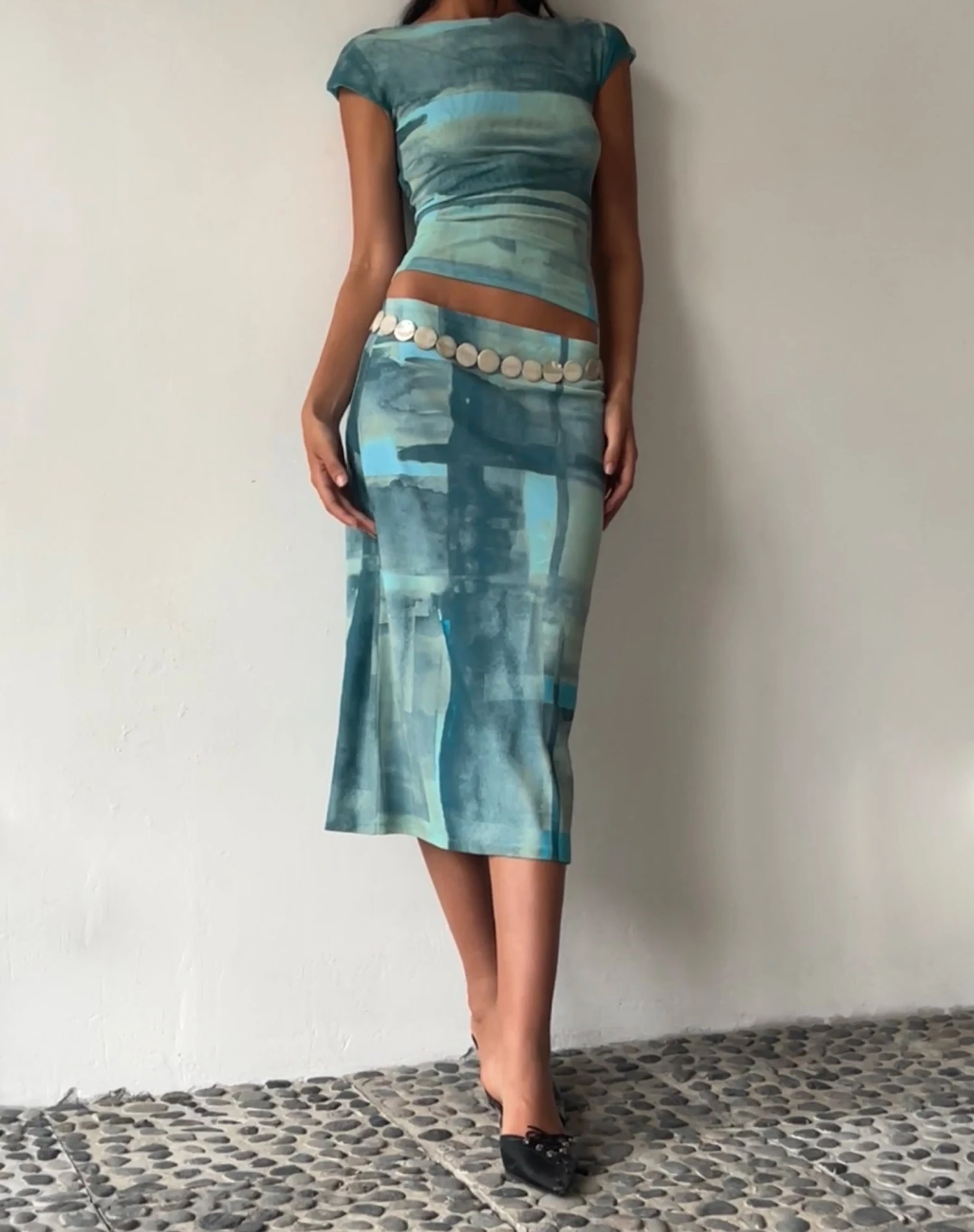 Add some print to your wardrobe with our Gia skirt. A low rise midi fit featuring in a mesh tonal blue and green paint brush print. Complete the co-ord with our Nova top.