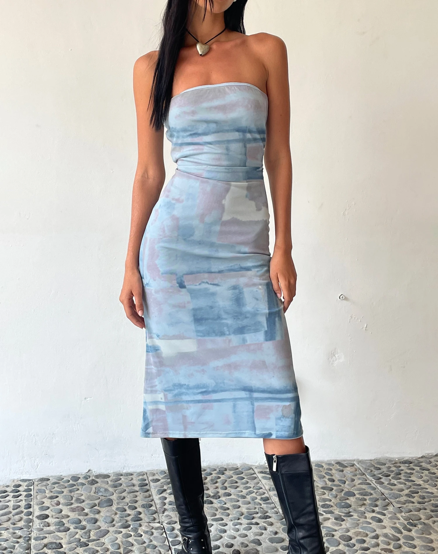 Add some print to your wardrobe with our Suki dress. Featuring a midi length with bandeau design, and bodycon fit in a mesh tonal pink and blue abstract paint brush print.