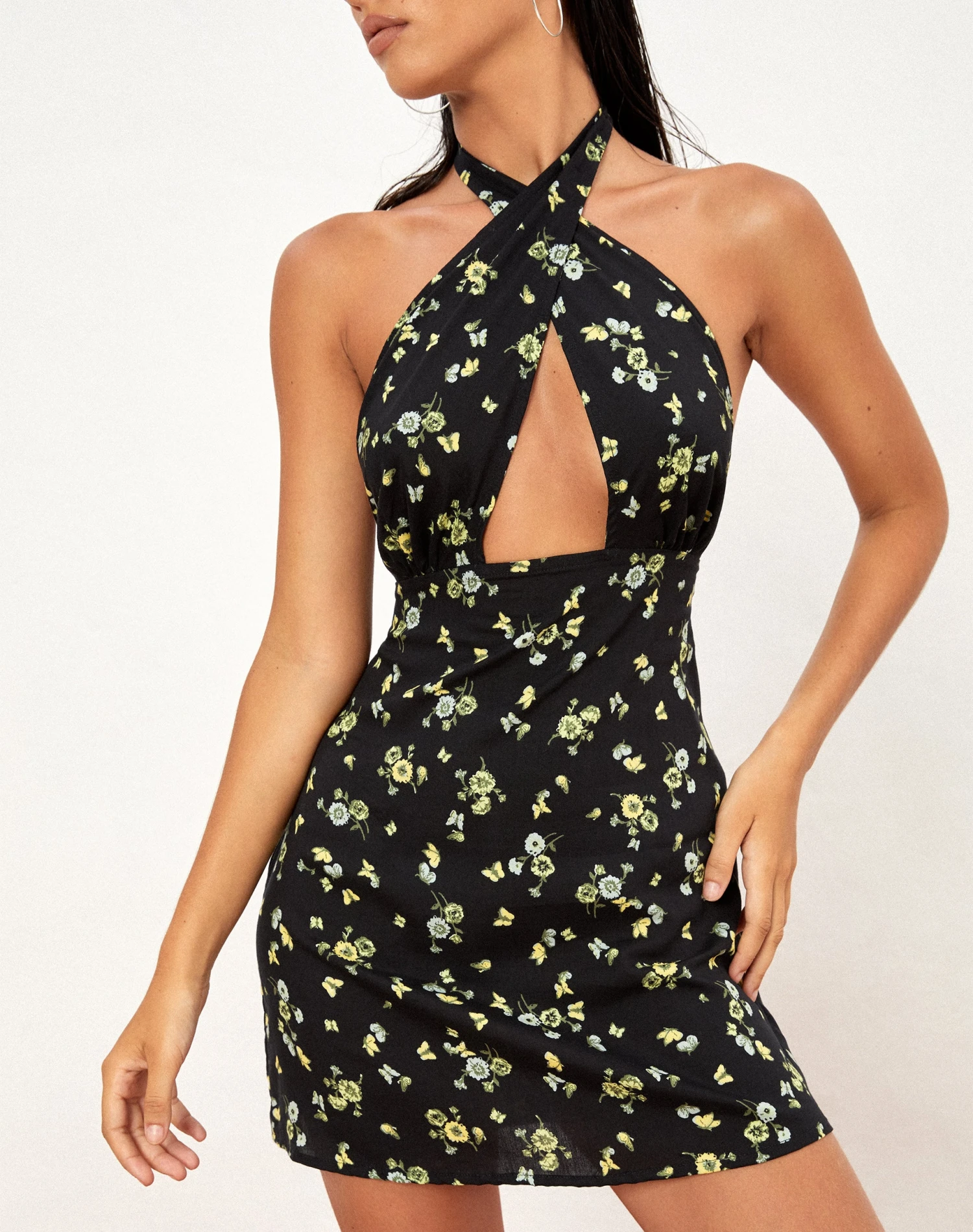 The Moura dress is your summer staple. In a lemon and lime print, this mini dress features a cutout detail to the front with thick cross over straps and open back. We’ve styled ours with a knee high boot.