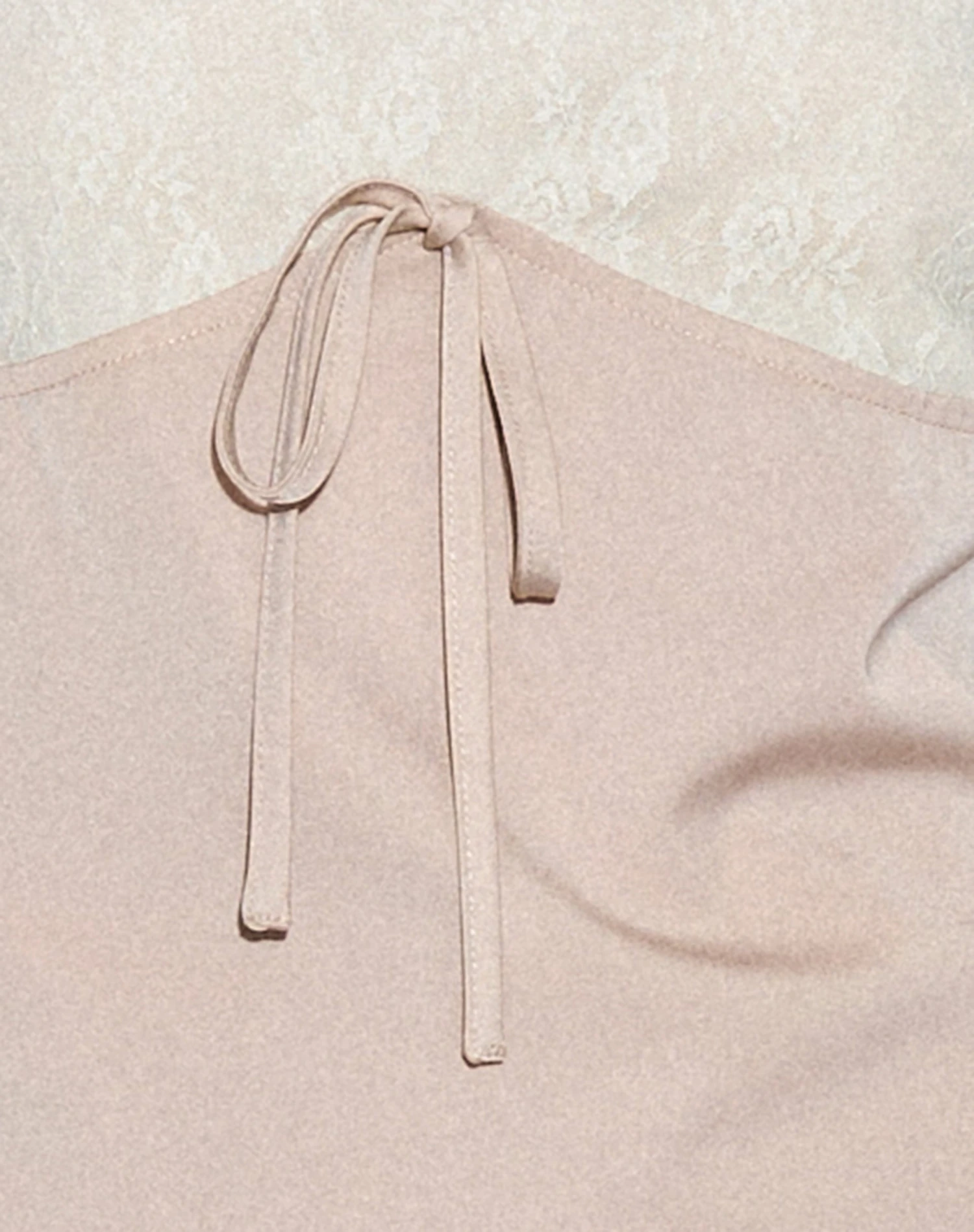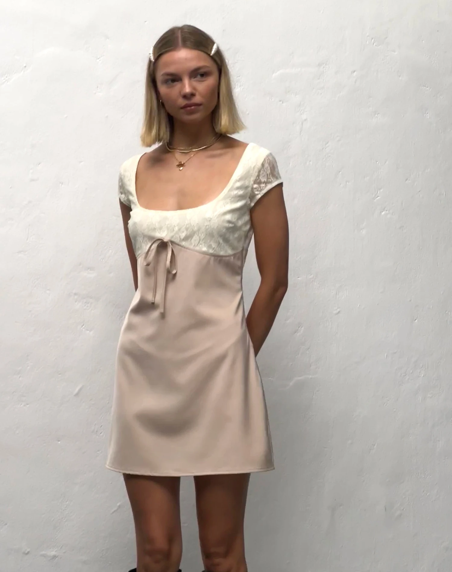 The Nauli Mini Dress is a must-have. The top half of the dress features short sleeves in a lace, ivory detail. The bottom half of the dress comes in a soft, buttercream colour satin. Also featuring a bow detail at the front.