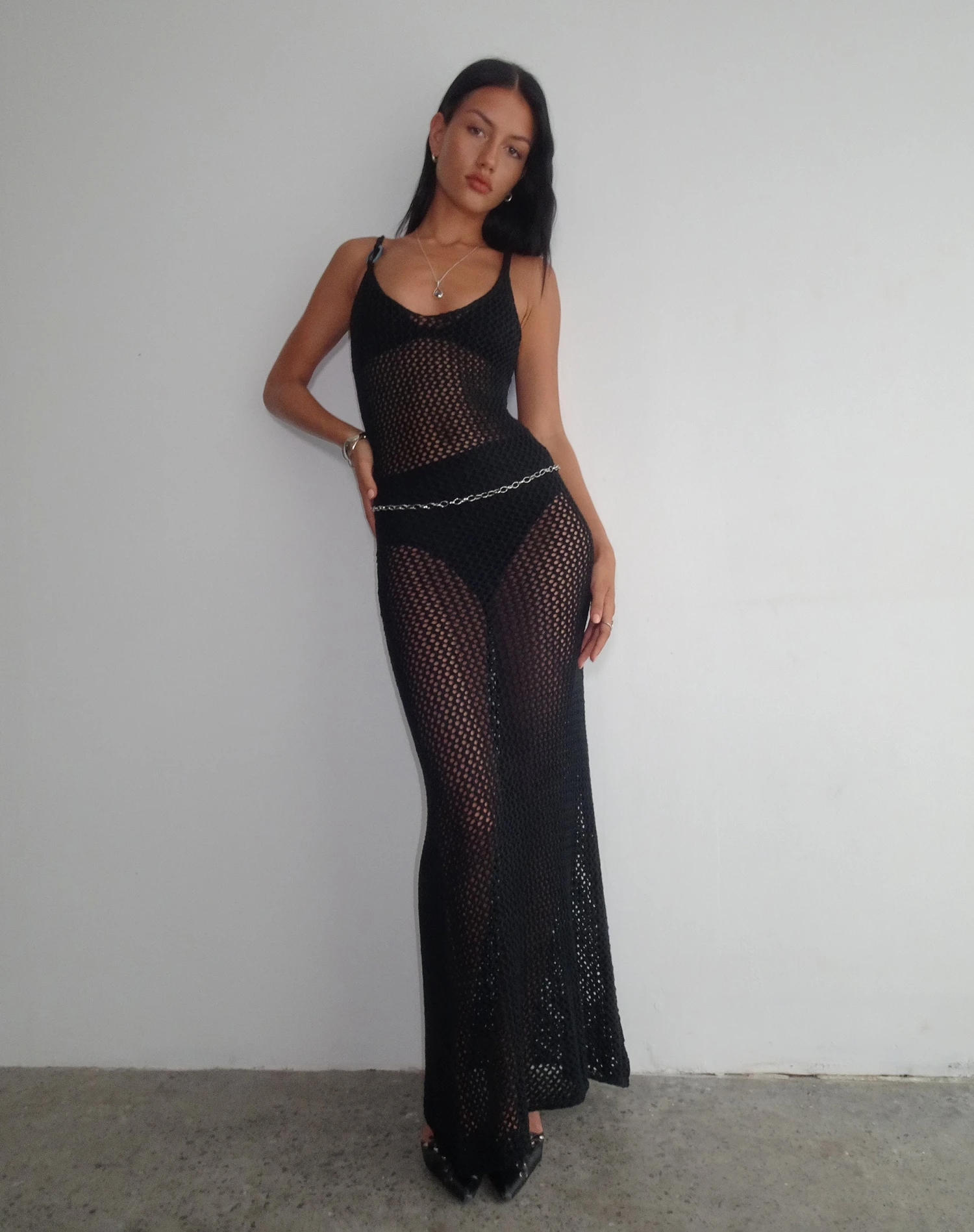 In a black open knit, our Nazir dress features a bodycon fit and thick straps with an o ring detail in a maxi length.
