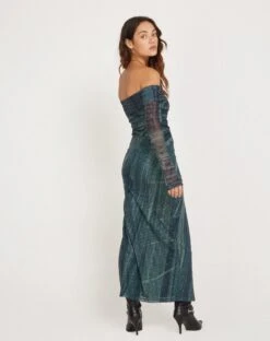 This Niwaya bodycon dress in blue, features a long sleeve off the shoulder design with a cut out detail at centre front and back. Featuring in a Stretchy lycra fabric with rib design and mini length fit.