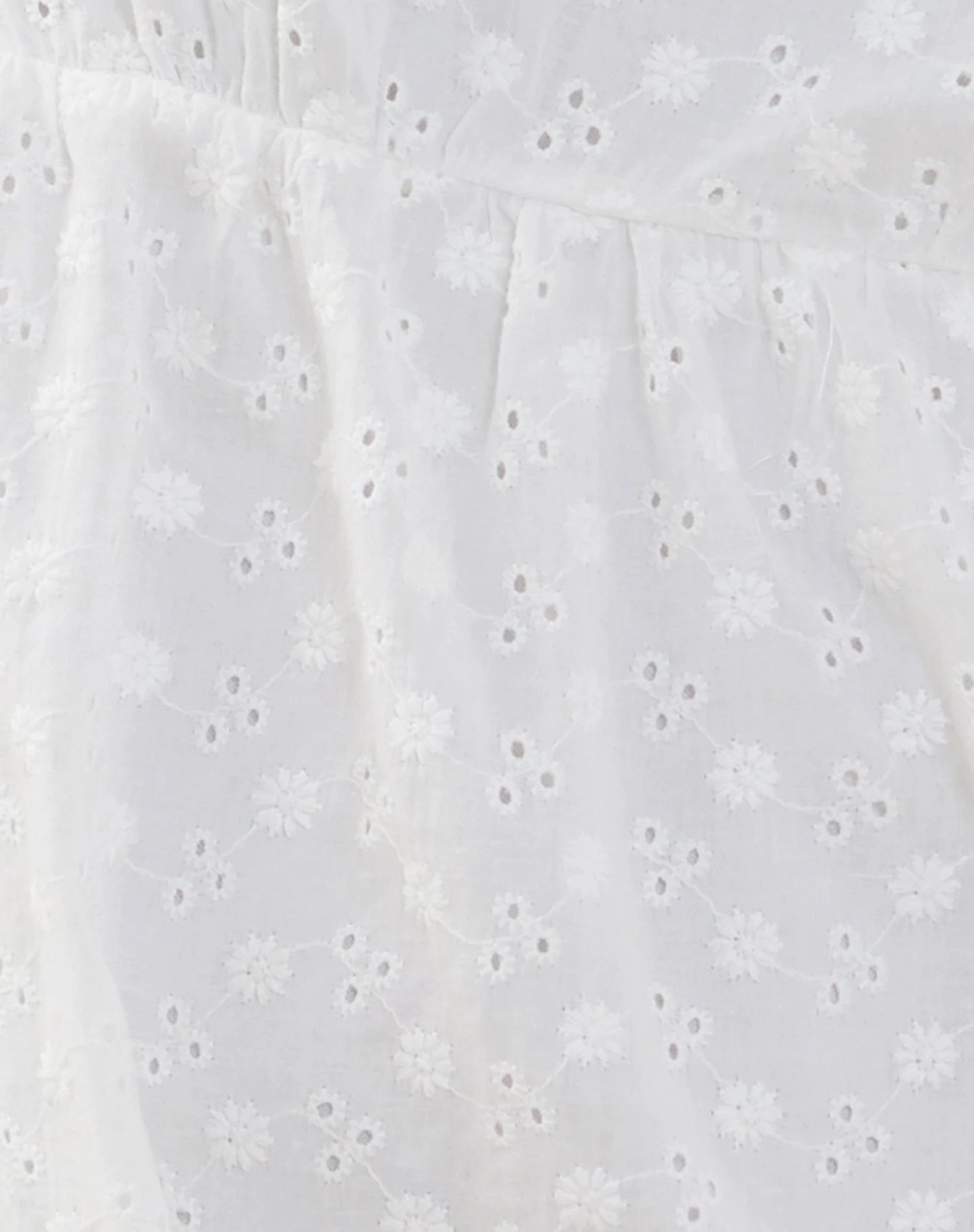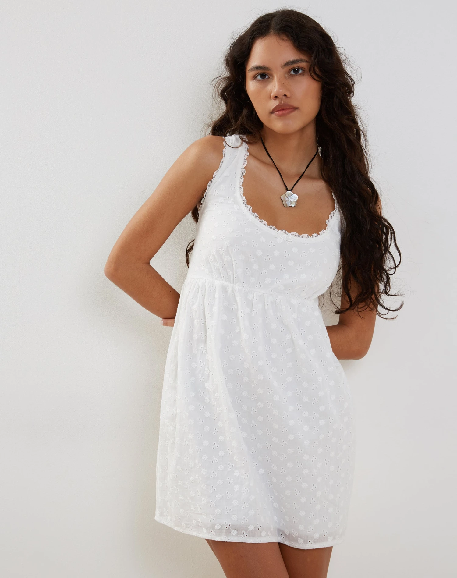 The Noja dress features a flared, mini fit with an elasticated waistline, thick, cami straps and a scoop neckline with a lace trim and decorative bow. Detailed with eyelet lace broderie anglaise.