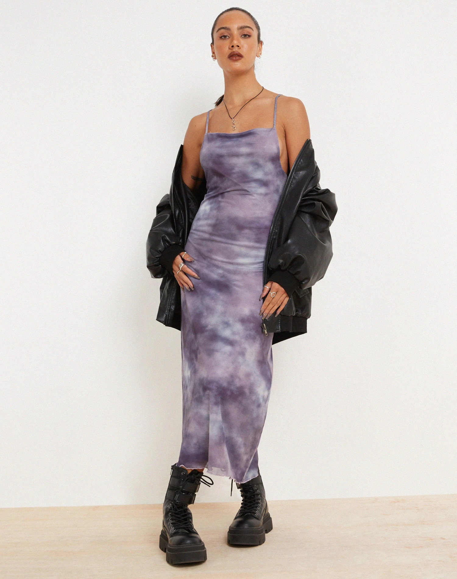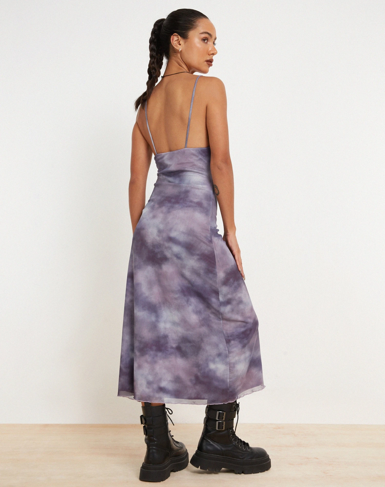 Midi length dress with spaghetti straps in a fully lined printed stretch mesh fabric.