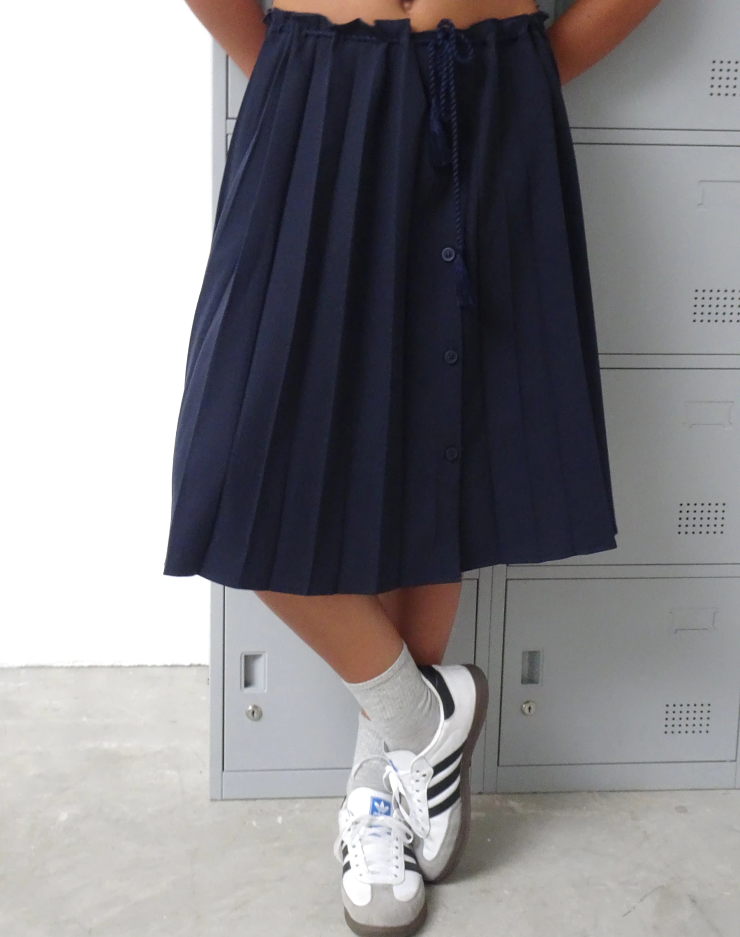 The Priha is a low rise pleated midi skirt featuring a drawcord adjustable waist, with front buttons in a non stretch navy tailoring fabric. Pair with our Salda Top for a sporty look.