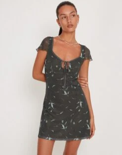 Noura Mesh Mini Dress In Floral Khaki Silhouette
