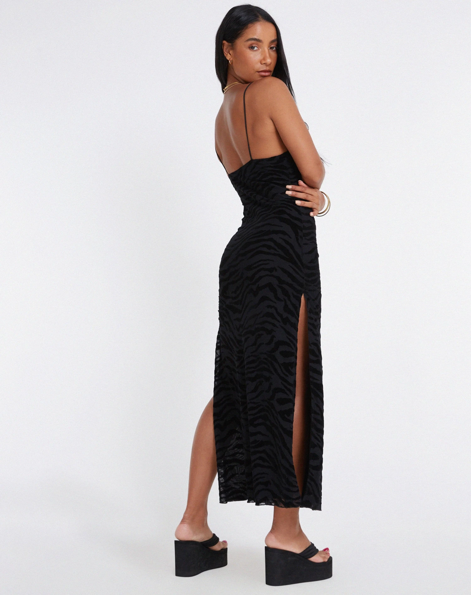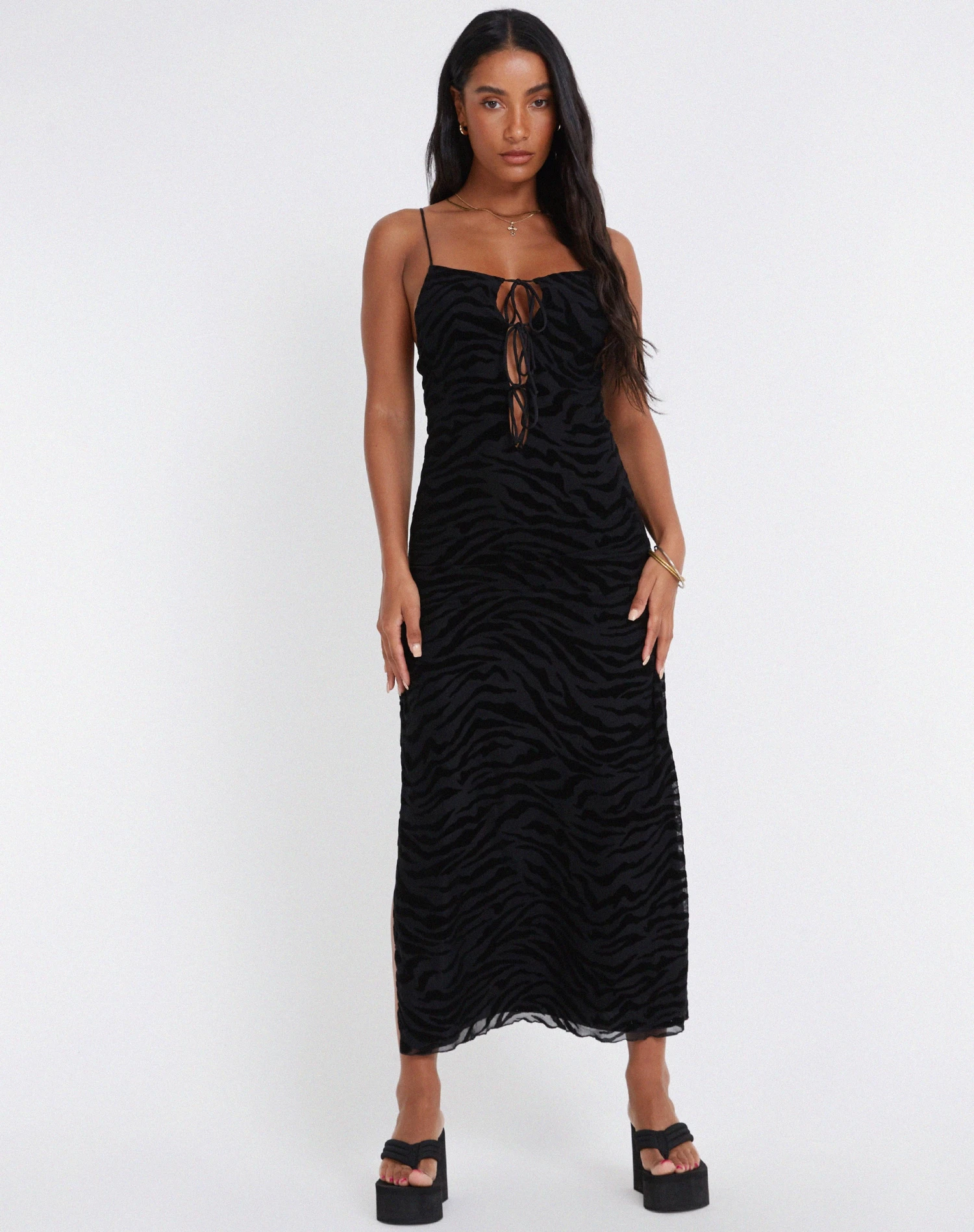 One to add to your basket for your next holiday. The Rayuma dress, in a black zebra print, features a maxi, bodycon fit with a scoop neckline, thin straps and cutout, tie up detailing to the front. Style with some chunky sandals.