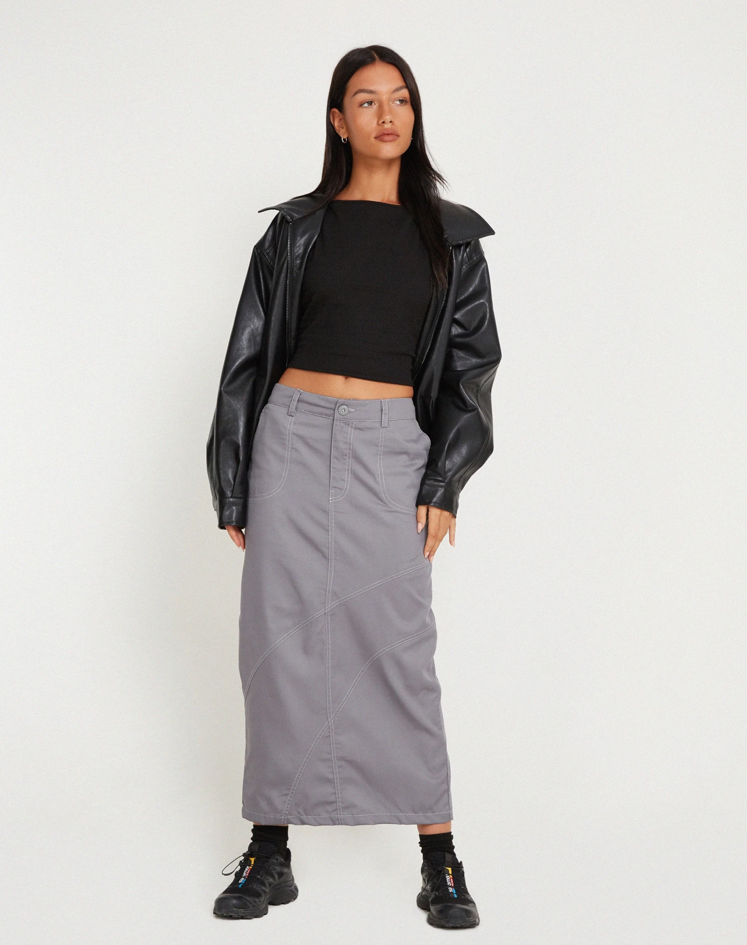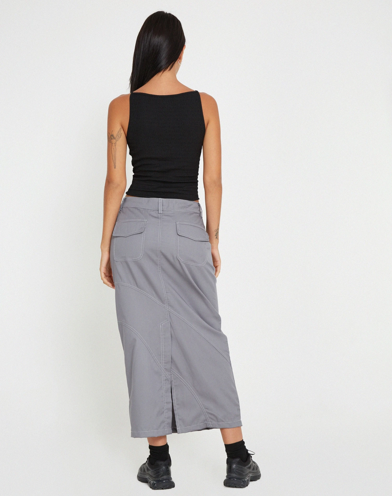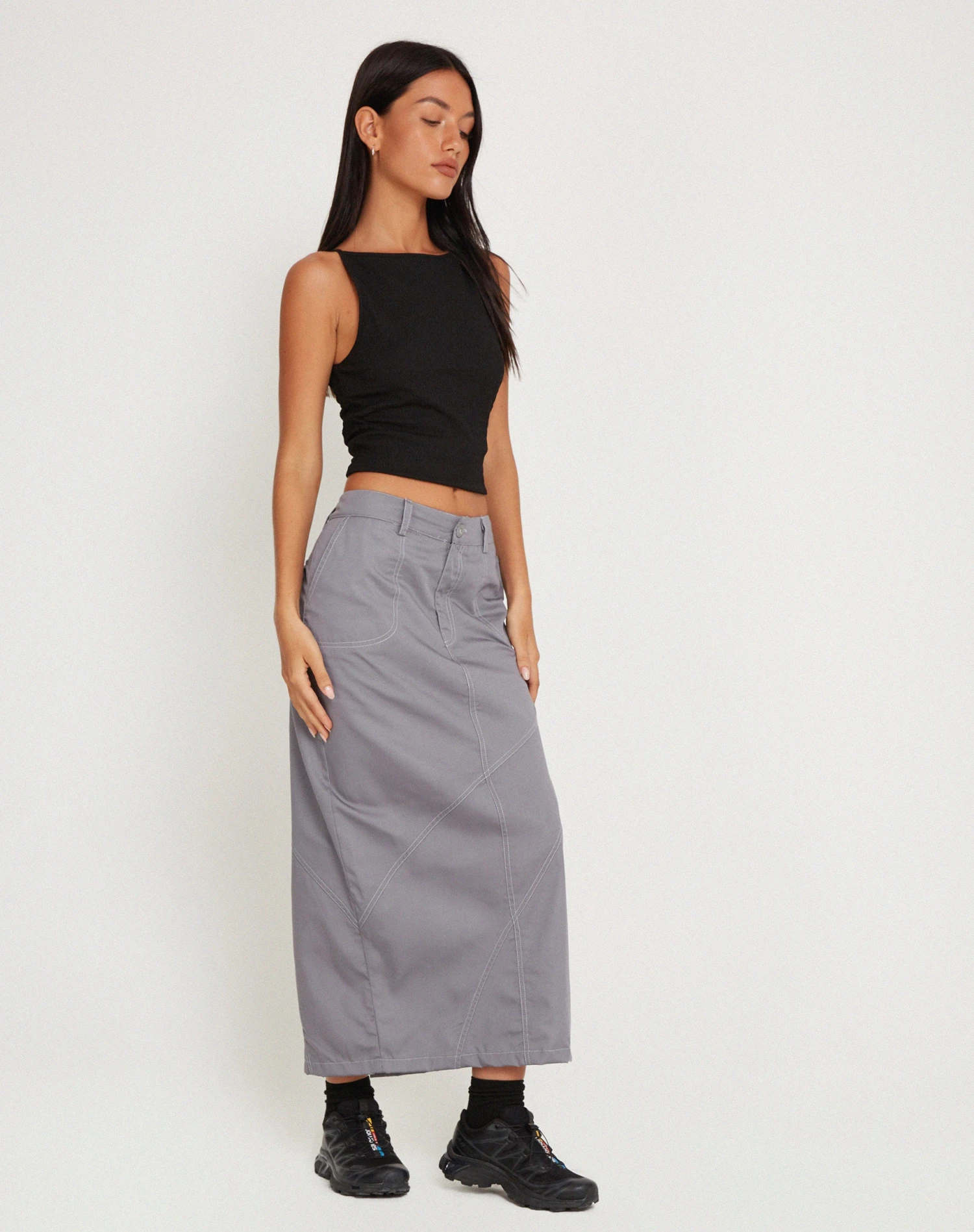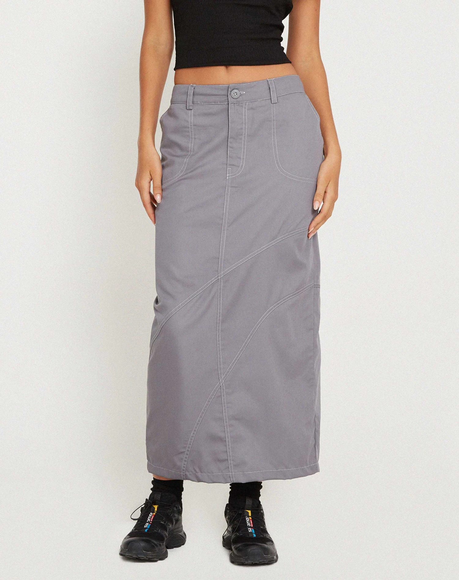 Stay trendy with our Reese cargo skirt. In a charcoal grey cotton drill fabric, it features midi in length with a regular fit, mid-rise waistband and belt loops. Detailed with white contrast top stitching. Simply style with our Dudley top.