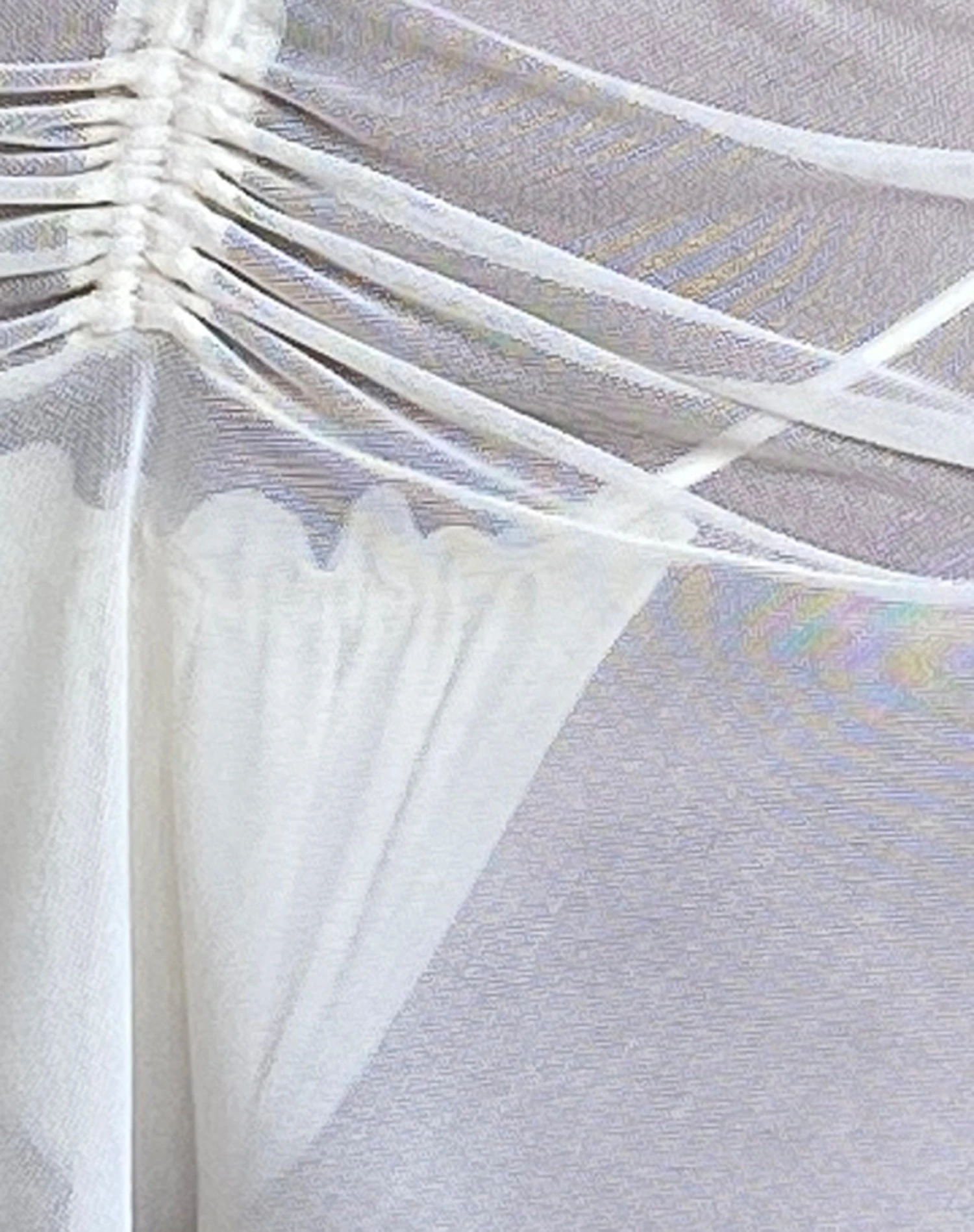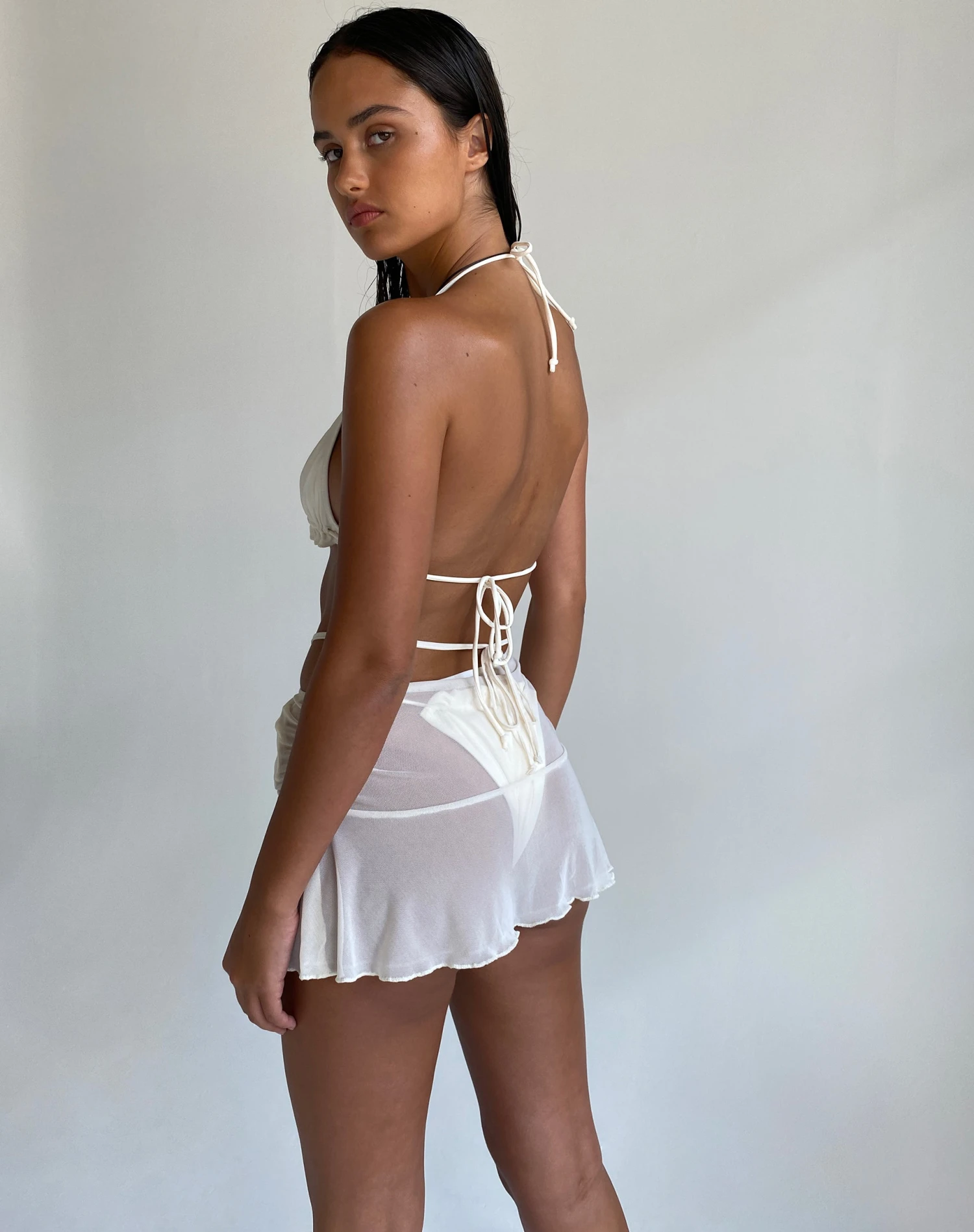 The swim skirt you need. The Rudra comes in a cream mesh material, a mini fit and straps around the side. Pair with our Purna top and Limara bottom for a co-ordinated beach look.Â