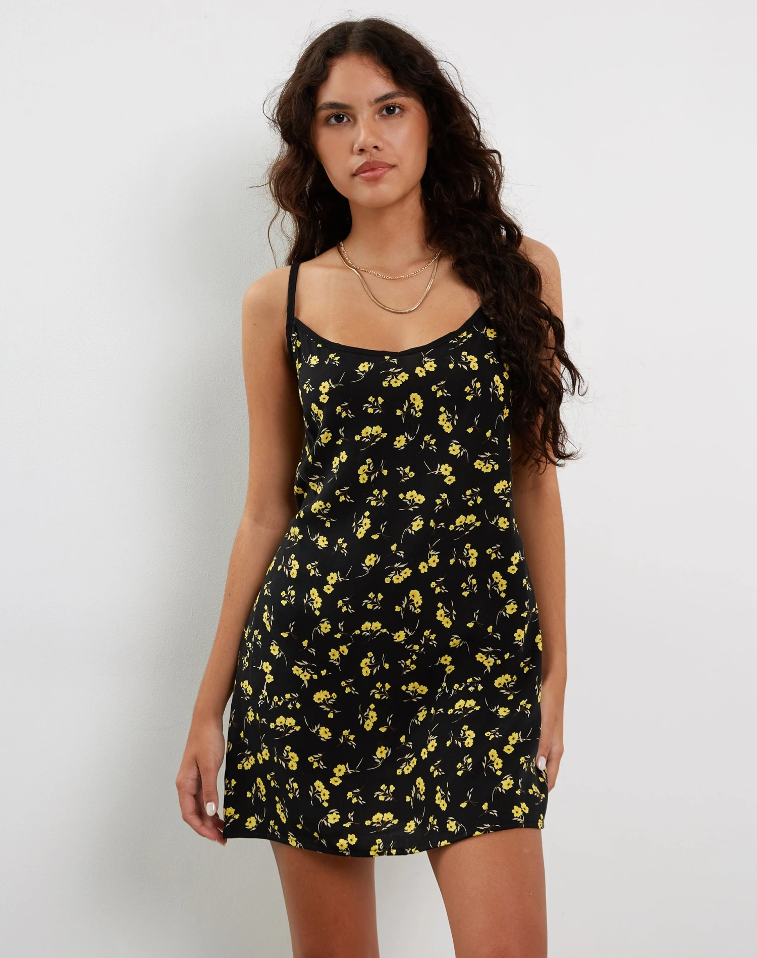 Add some print to your wardrobe with the Samiya dress. Featuring a mini length hem with adjustable, cami straps and a round neckline in black with a repeat yellow floral print.