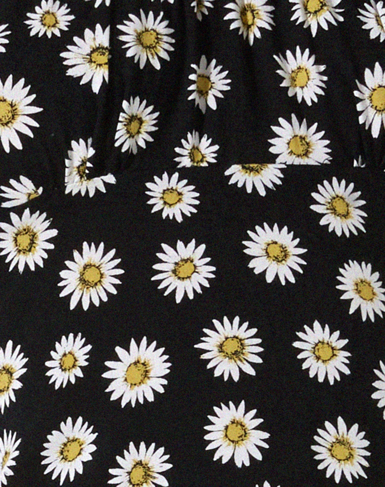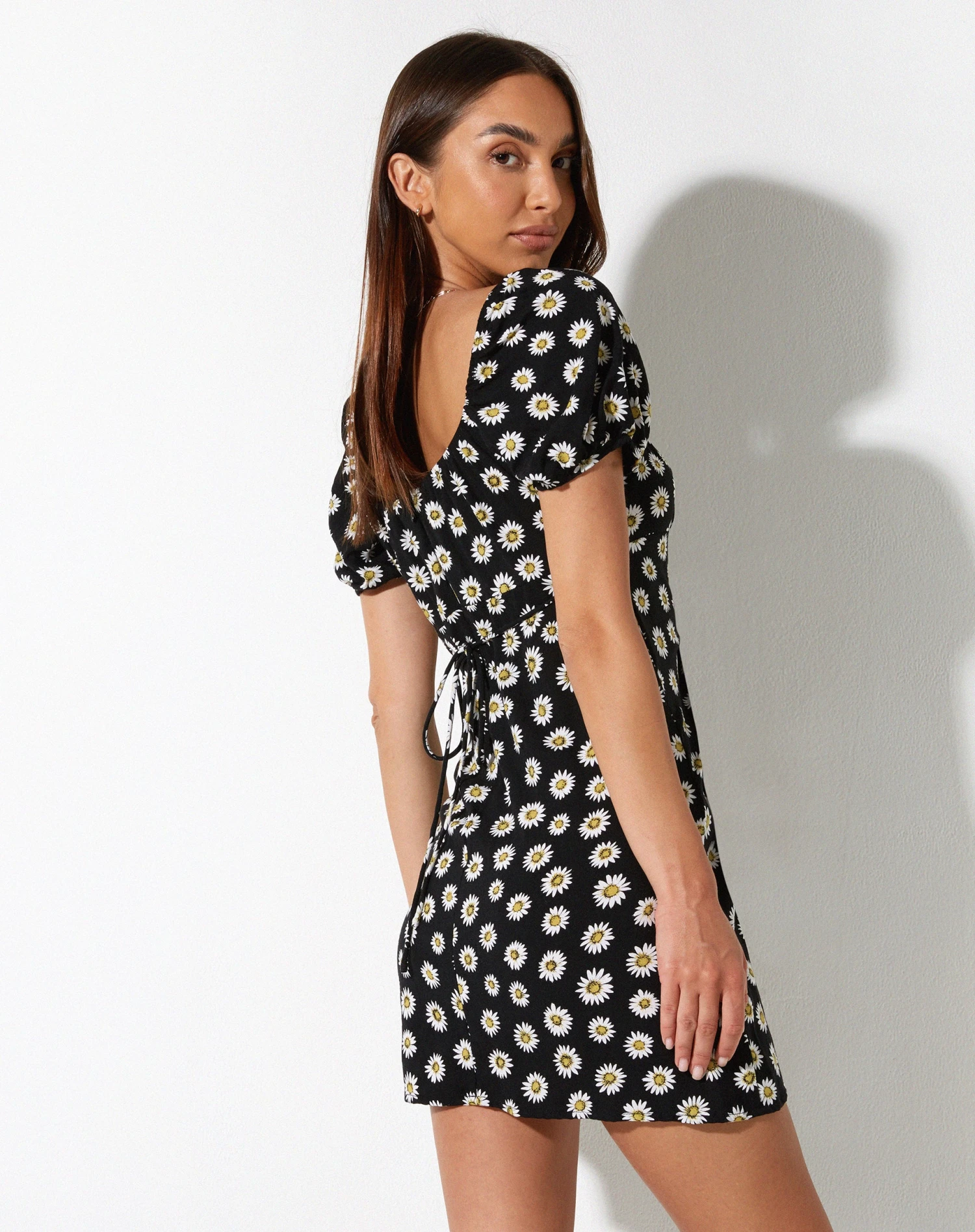 In a black woven fabric, the Sasi dress features a mini A-line hem with a scoop neckline, short, cuffed sleeves and a concealed zip with tie straps at the back. Detailed with an all-over repeat daisy print.