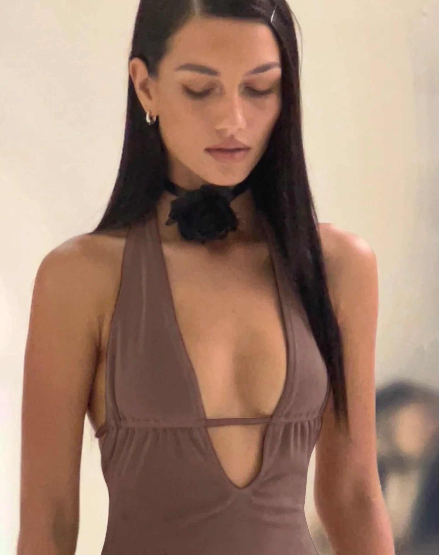 Mini slinky dress with halterneck straps in peppercorn. Featuring a deep V neckline and open back with tie up detailing.