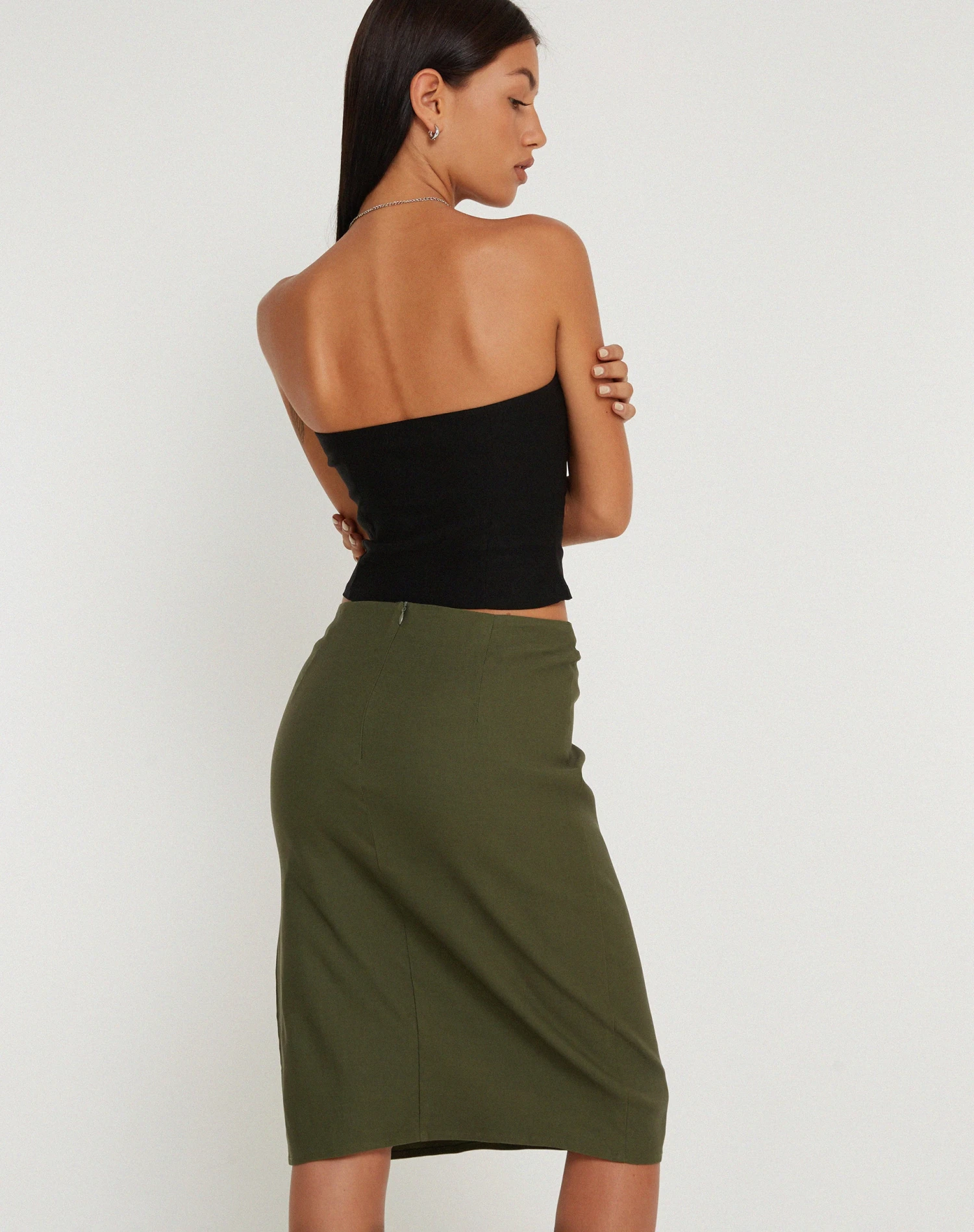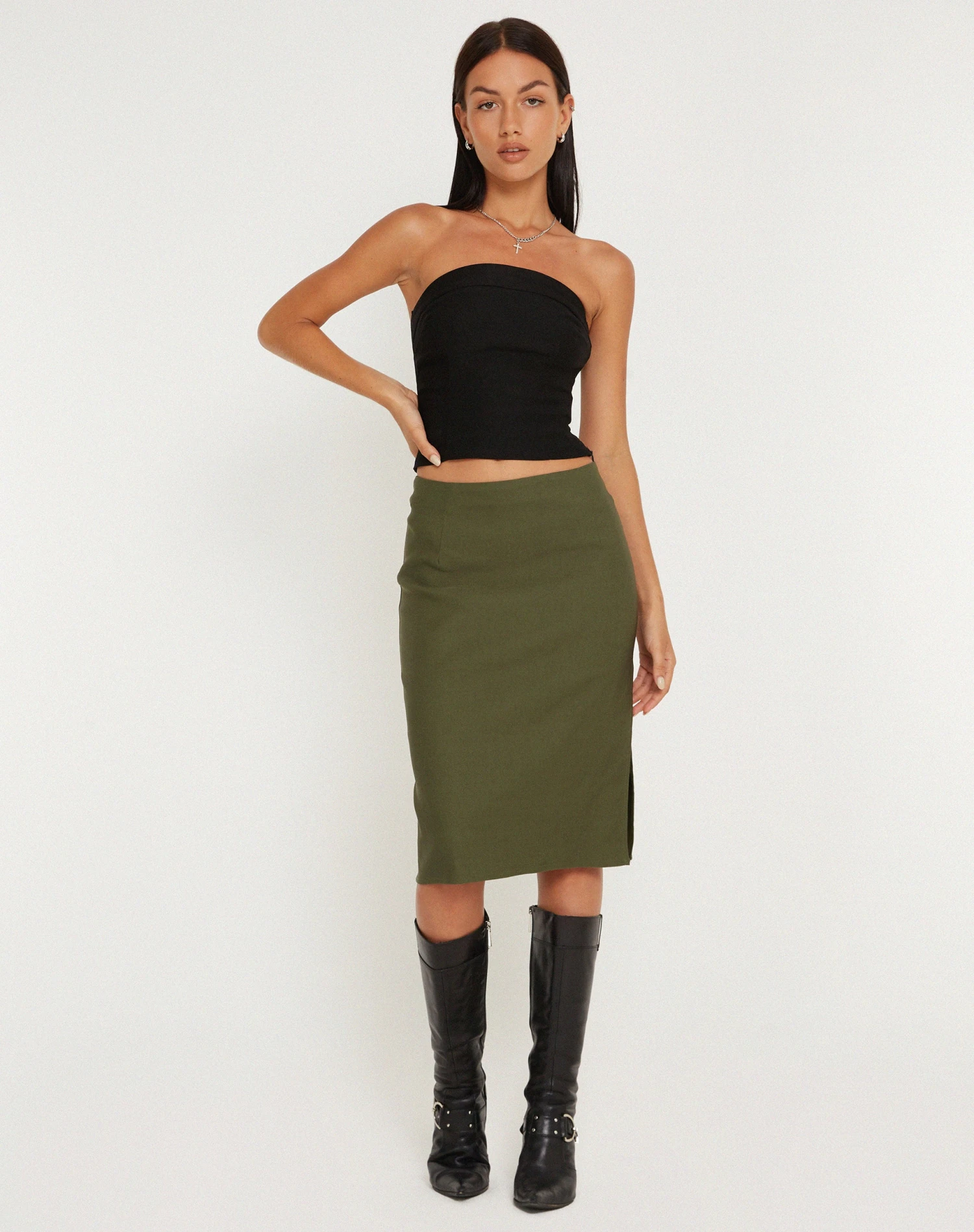 The Sekoji skirt can take you from day to night. In khaki, it features a midi, low rise fit with a side slit.