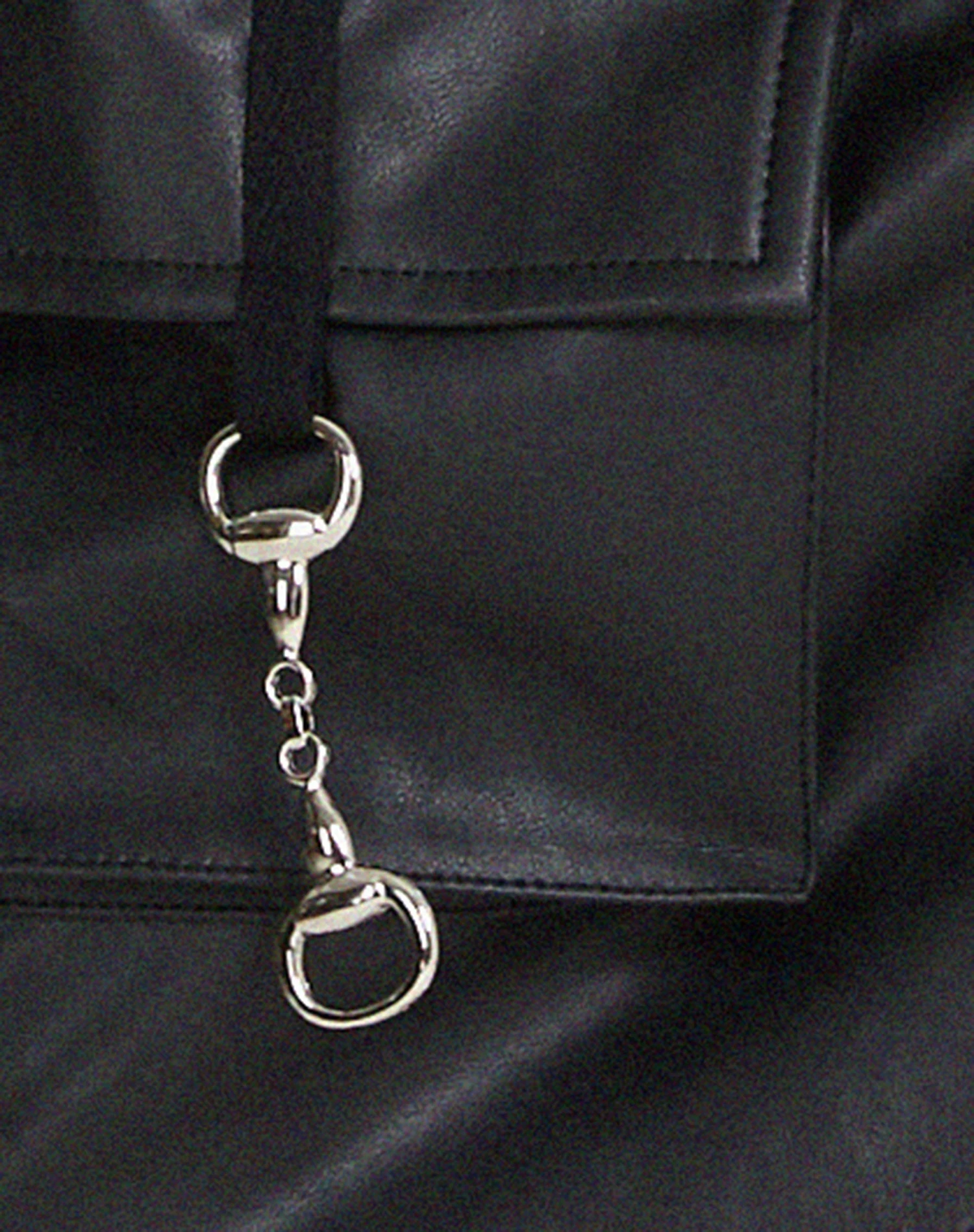 Mini wrap skirt in a black PU fabric, with hardware fastening at the side seam and 3D patch pocket. Featuring a metal hardware on the flap. Complete the look with our Olivia jacket and a black tee.