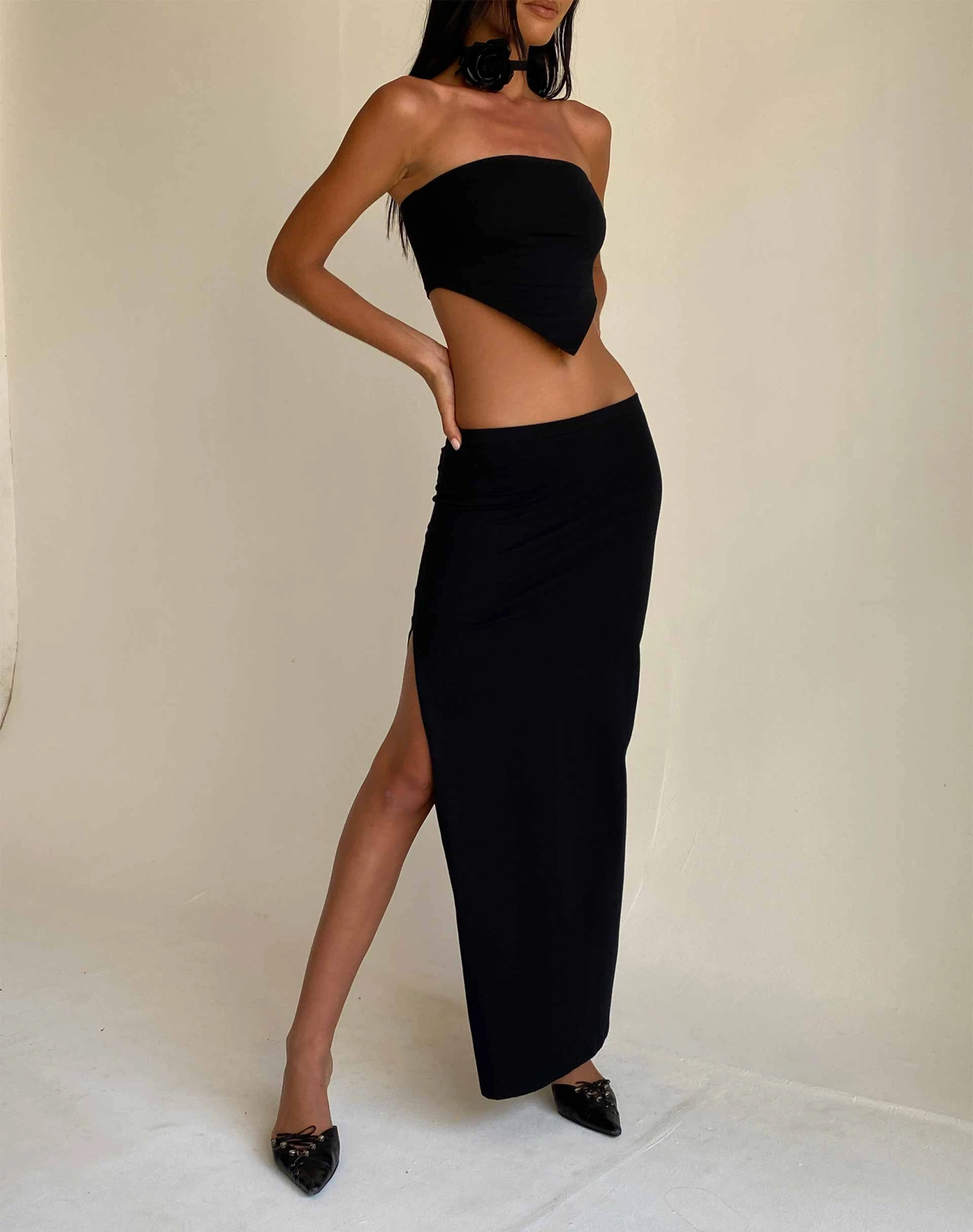 Low rise maxi skirt in a stretch black jersey with a subtle side split detailing. Complete the ‘fit with the Ladshe top.
