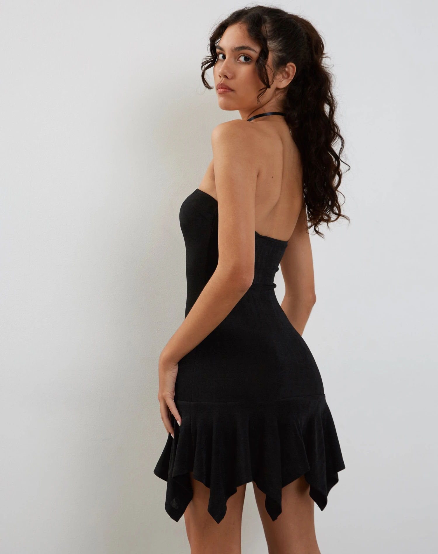 You cant go wrong with a little black dress… Our Towina dress features a sleeveless bandeau bodycon fit and flowing mini length skirt in a stretch black slinky material.