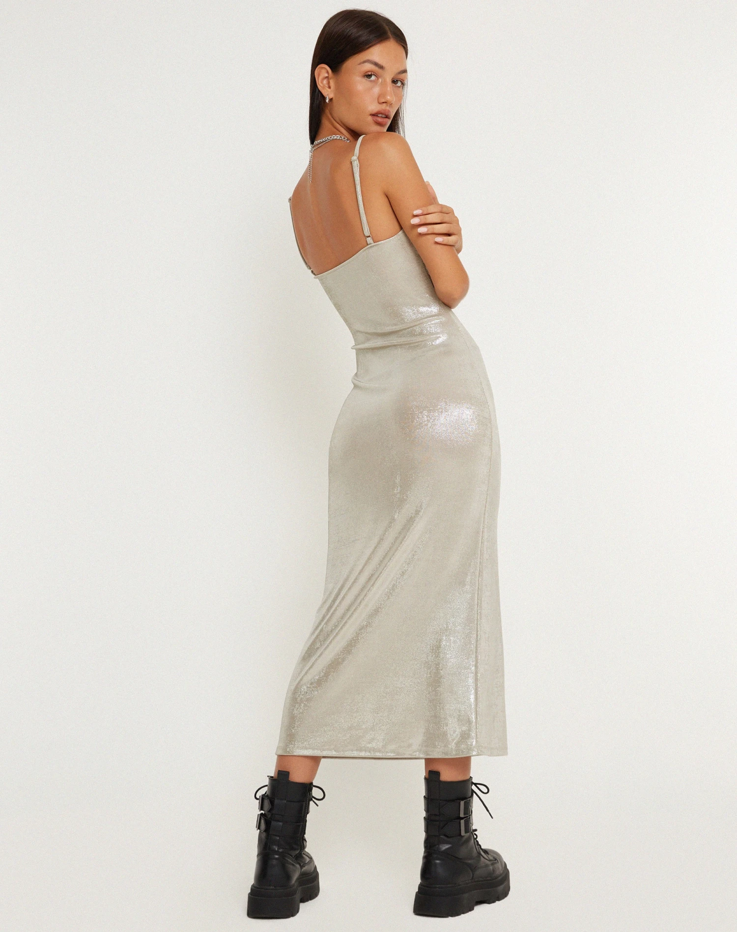 Slinky midi dress in silver shimmer, featuring a V neckline and thin straps. This silver dress is perfect for party season.