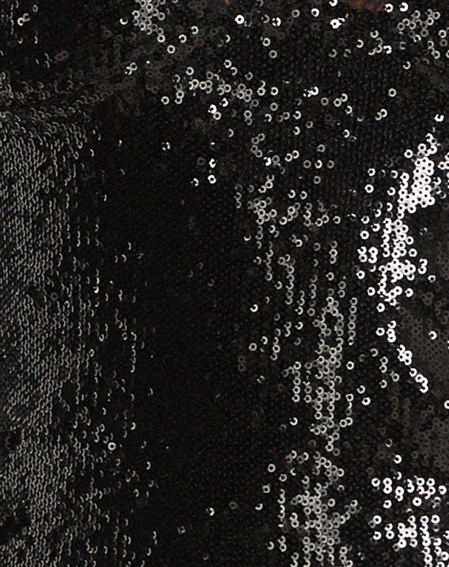 Mini length LBD in a sequin fabric. Featuring thin straps with a deep V neckline and a side split. Finished with a lace trim.