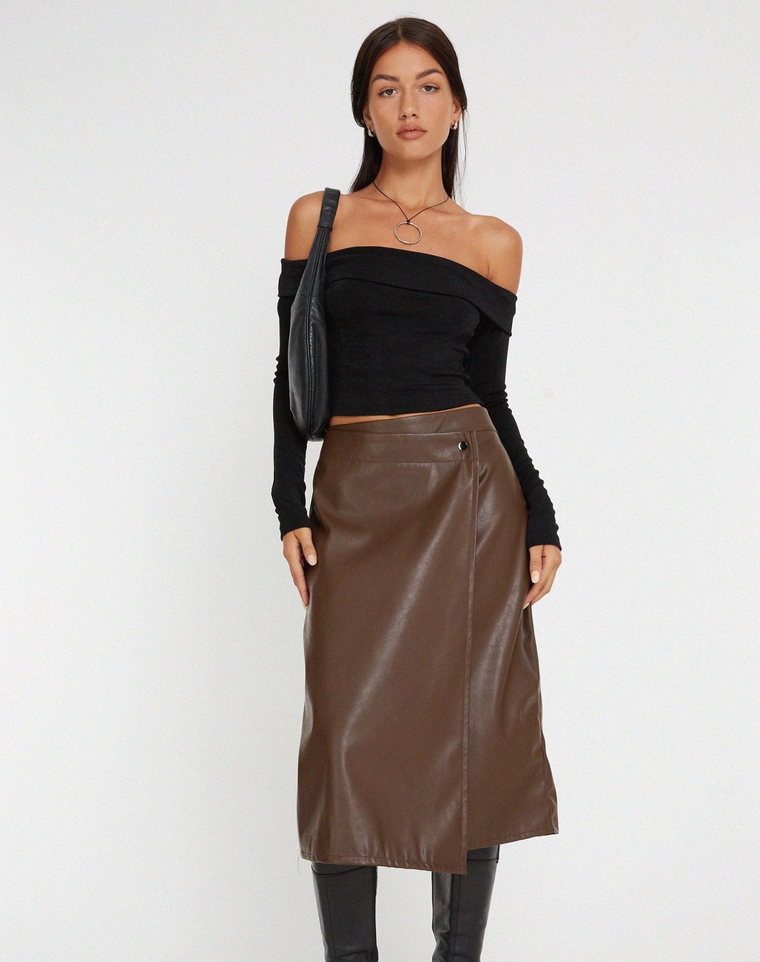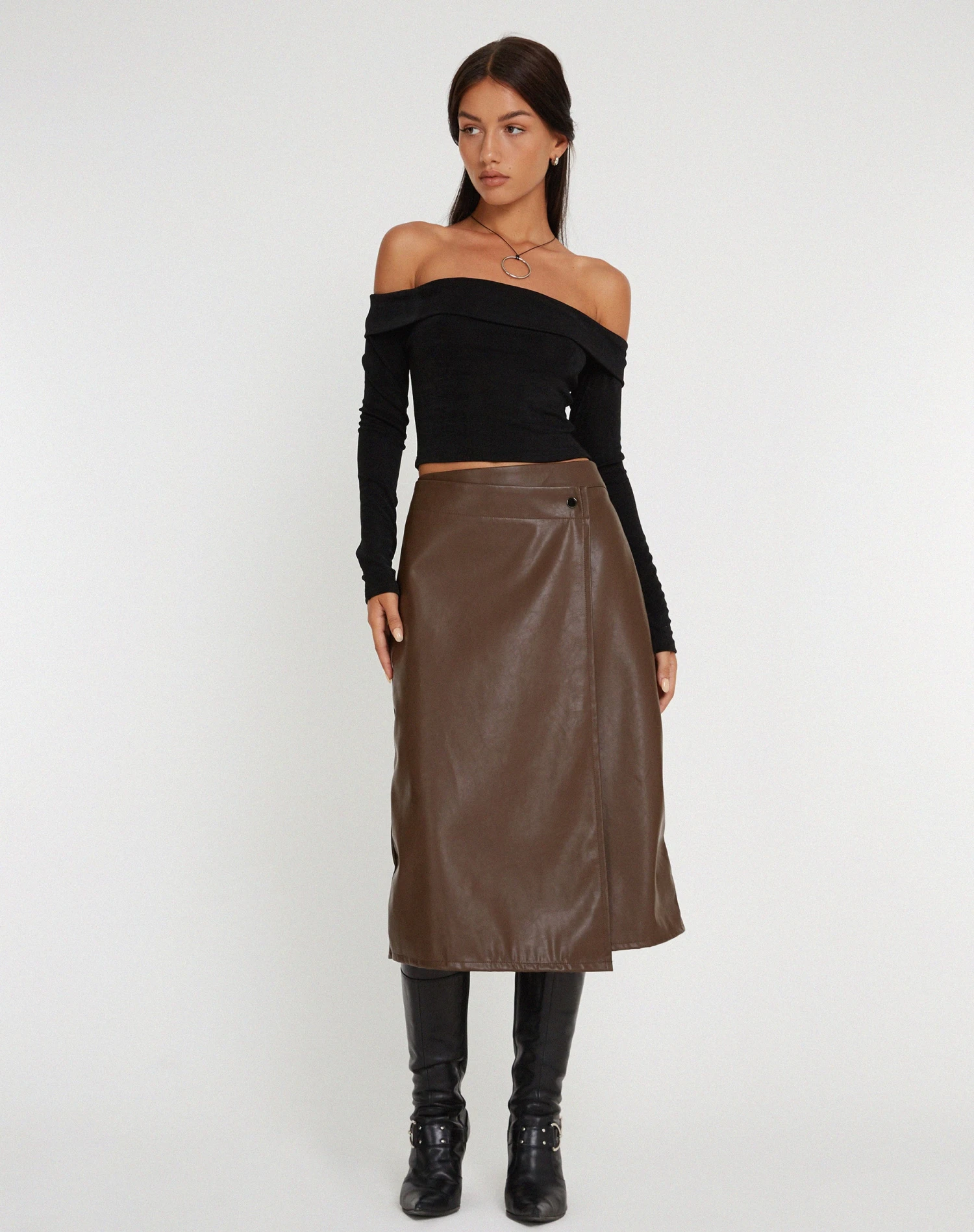 Low rise midi skirt, in PU brown. Featuring a wrap design with asymmetrical waist and back zip . Pair with our classic Koriya bardot top in black.